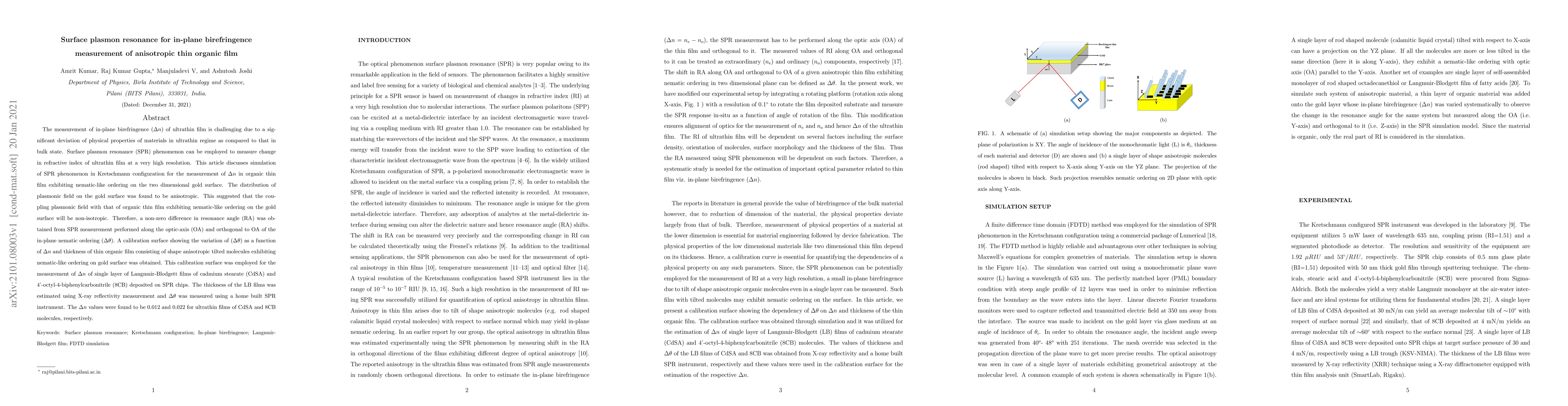 The measurement of in-plane birefringence ($\Delta{n}$) of ultrathin film is challenging due to a significant deviation of physical properties of materials in ultrathin regime as compared to that in bulk state. Surface plasmon resonance (SPR) phenomenon can be employed to measure change in refractive index of ultrathin film at a very high resolution. This article discusses simulation of SPR phenomenon in Kretschmann configuration for the measurement of $\Delta{n}$ in organic thin film exhibiting nematic-like ordering on the two dimensional gold surface. The distribution of plasmonic field on the gold surface was found to be anisotropic. This suggested that the coupling plasmonic field with that of organic thin film exhibiting nematic-like ordering on the gold surface will be non-isotropic. Therefore, a non-zero difference in resonance angle (RA) was obtained from SPR measurement performed along the optic-axis (OA) and orthogonal to OA of the in-plane nematic ordering ($\Delta\theta$). A calibration surface showing the variation of ($\Delta\theta$) as a function of $\Delta{n}$ and thickness of thin organic film consisting of shape anisotropic tilted molecules exhibiting nematic-like ordering on gold surface was obtained. This calibration surface was employed for the measurement of $\Delta{n}$ of single layer of Langmuir-Blodgett films of cadmium stearate (CdSA) and 4'-octyl-4-biphenylcarbonitrile (8CB) deposited on SPR chips. The thickness of the LB films was estimated using X-ray reflectivity measurement and $\Delta\theta$ was measured using a home built SPR instrument. The $\Delta{n}$ values were found to be 0.012 and 0.022 for ultrathin films of CdSA and 8CB molecules, respectively.