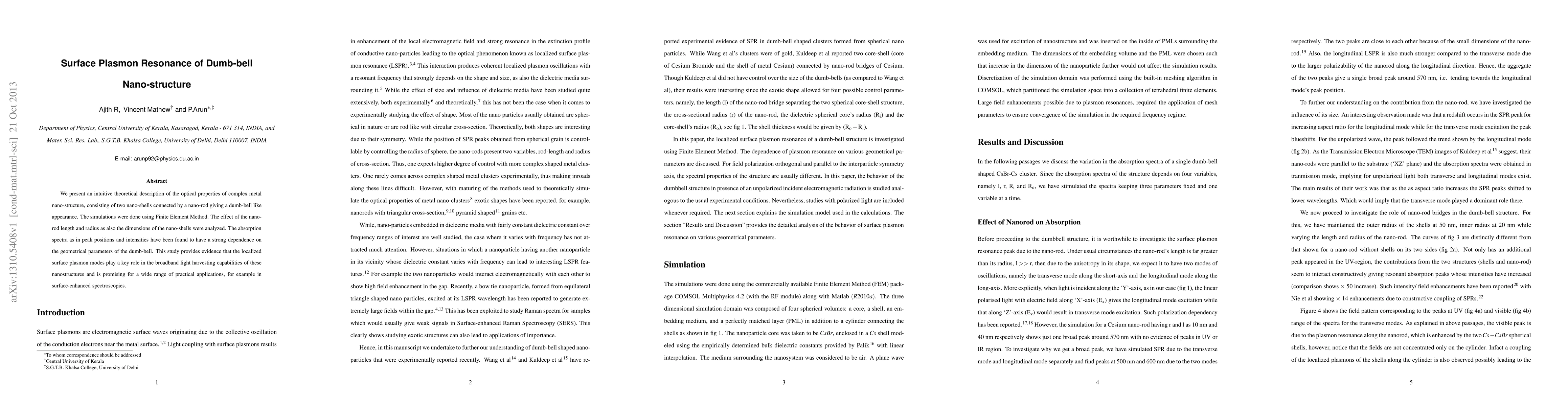 We present an intuitive theoretical description of the optical properties of complex metal nano-structure, consisting of two nano-shells connected by a nano-rod giving a dumb-bell like appearance. The simulations were done using Finite Element Method. The effect of the nano-rod length and radius as also the dimensions of the nano-shells were analyzed. The absorption spectra as in peak positions and intensities have been found to have a strong dependence on the geometrical parameters of the dumb-bell. This study provides evidence that the localized surface plasmon modes play a key role in the broadband light harvesting capabilities of these nanostructures and is promising for a wide range of practical applications, for example in surface-enhanced spectroscopies.