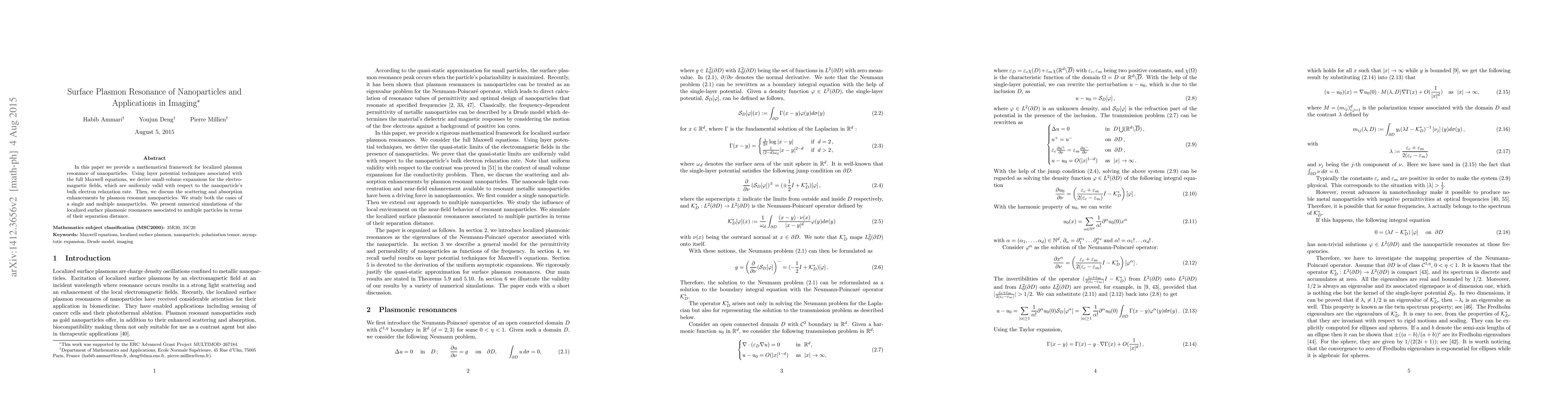 This paper develops a mathematical framework for localized plasmon resonance in nanoparticles, deriving electromagnetic field expansions and exploring scattering and absorption enhancements. It also presents numerical simulations of surface plasmonic resonances in multiple nanoparticles based on their separation distances.