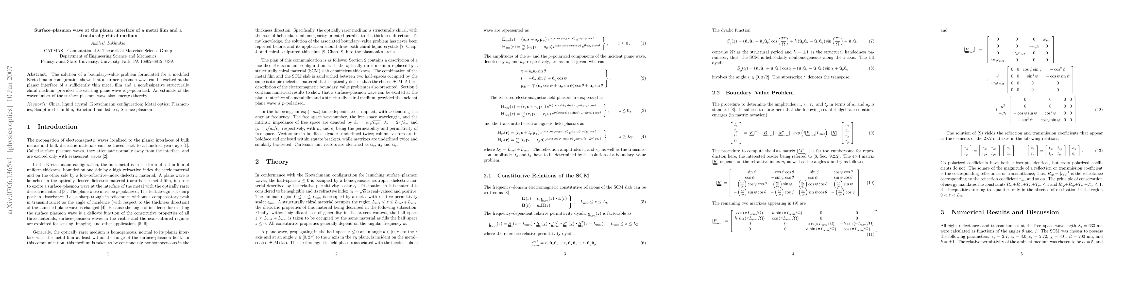 This paper demonstrates that a surface-plasmon wave can be excited at the interface between a thin metal film and a nondissipative structurally chiral medium when a p-polarized plane wave is used, solving a boundary-value problem for a modified Kretschmann configuration. The study also provides an estimate of the wavenumber of this surface-plasmon wave.