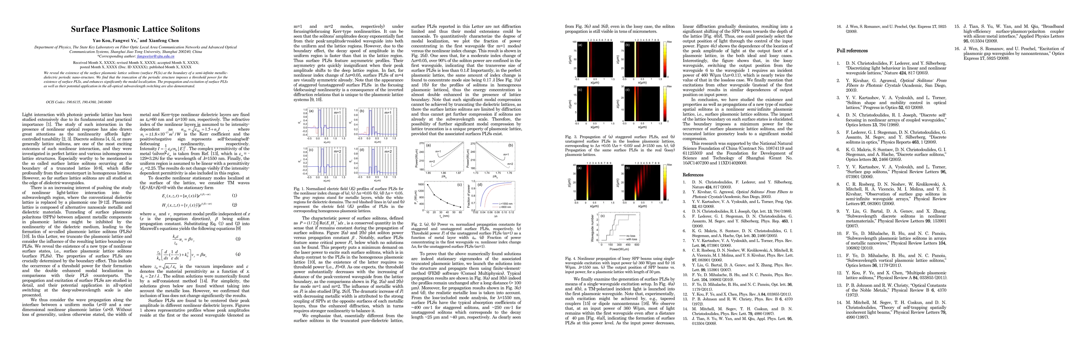 This paper demonstrates the existence of surface plasmonic lattice solitons (surface PLSs) in a metallic-dielectric periodic nano-structure, showing that a threshold power is required for their existence and that they exhibit enhanced modal localization. The study also explores their potential for all-optical subwavelength switching applications.