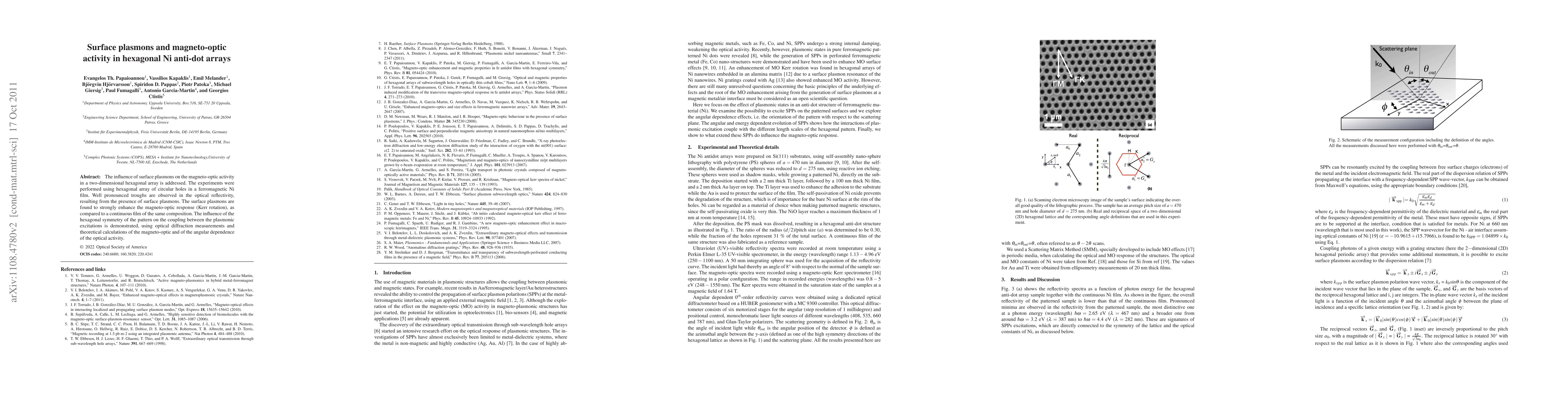 This paper investigates how surface plasmons in a hexagonal array of anti-dots in a ferromagnetic Ni film enhance magneto-optic activity, showing pronounced troughs in optical reflectivity due to surface plasmons. The study finds that the hexagonal symmetry significantly boosts the magneto-optic response compared to a continuous film.