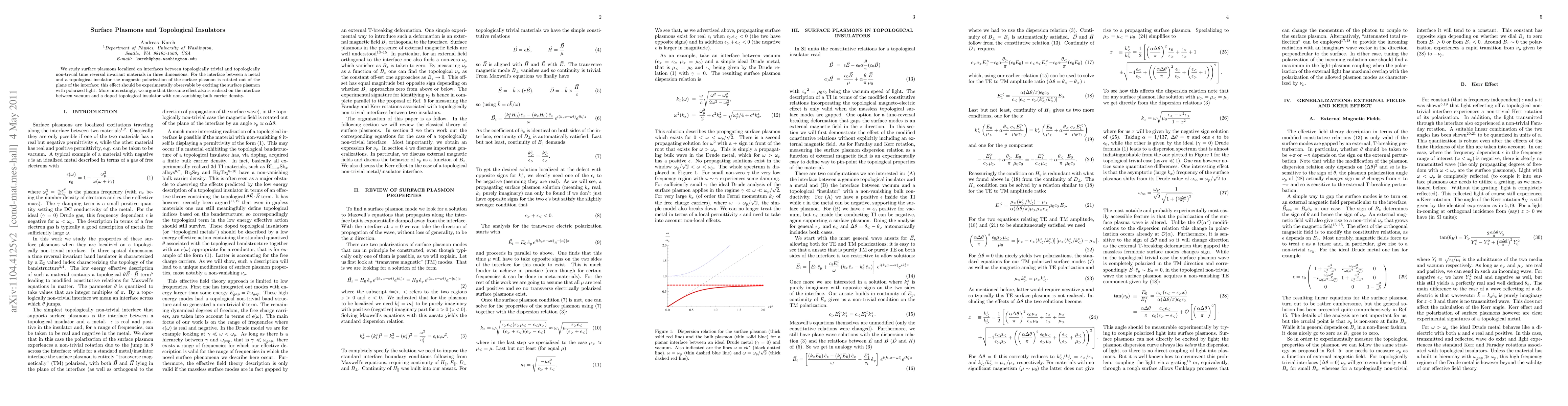 Researchers studied surface plasmons on interfaces between topological insulators and metals, finding a rotation of magnetic polarization out of the plane for one interface, and predicting a similar effect for another interface involving vacuum and doped topological insulators.