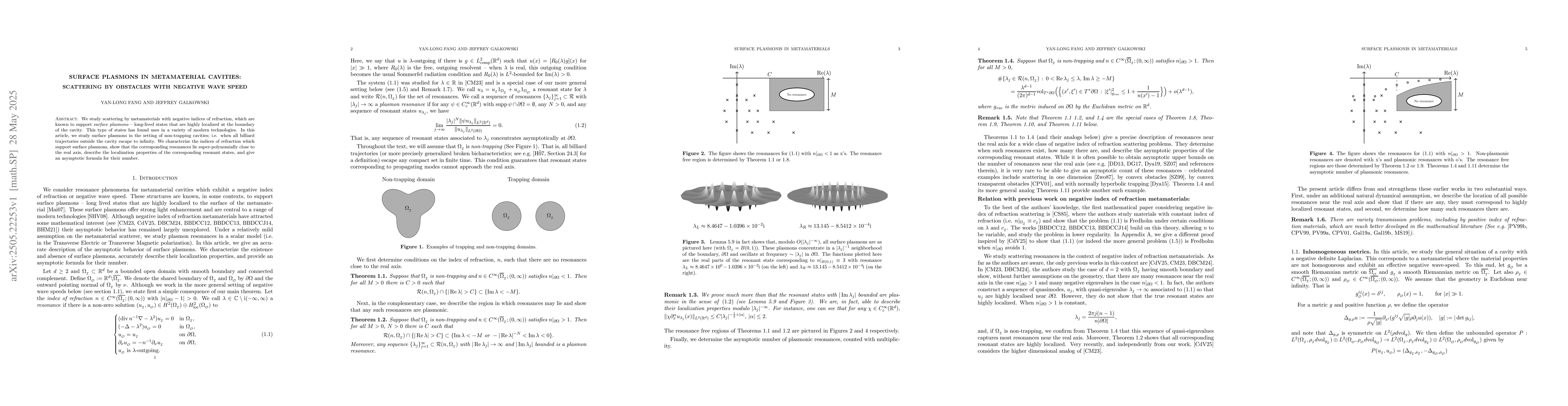 Researchers studied surface plasmons in non-trapping metamaterial cavities with negative wave speed indices of refraction, finding super-polynomially close resonances to the real axis and an asymptotic formula for their number.