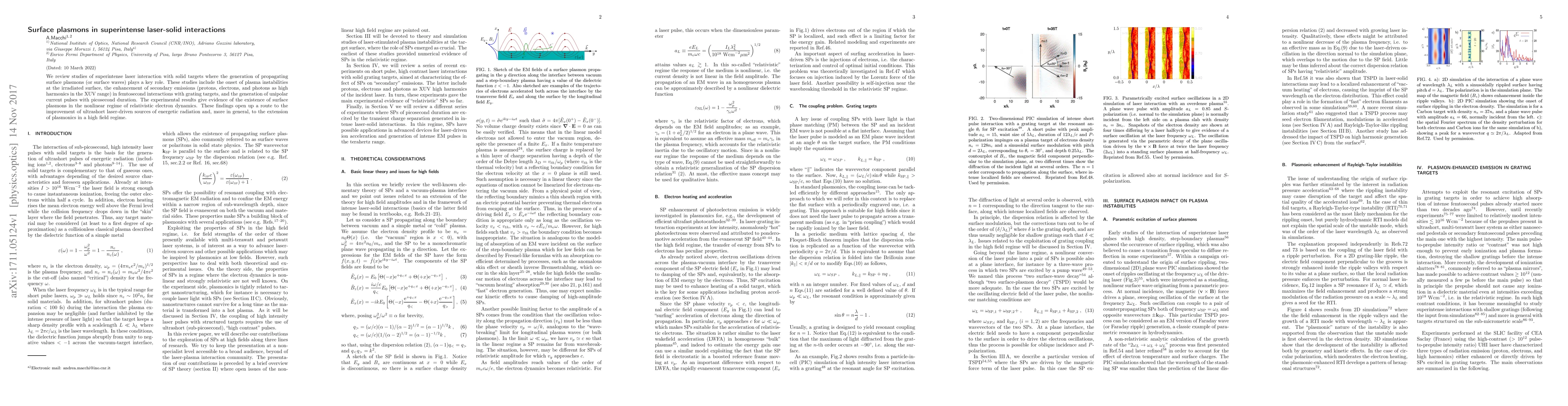 This paper reviews studies on the generation and role of surface plasmons in superintense laser interactions with solid targets, highlighting the onset of plasma instabilities, enhancement of secondary emissions, and picosecond current pulses. The findings suggest the existence of surface plasmons in the nonlinear regime, potentially improving ultrashort laser-driven radiation sources and advancing high-field plasmonics.