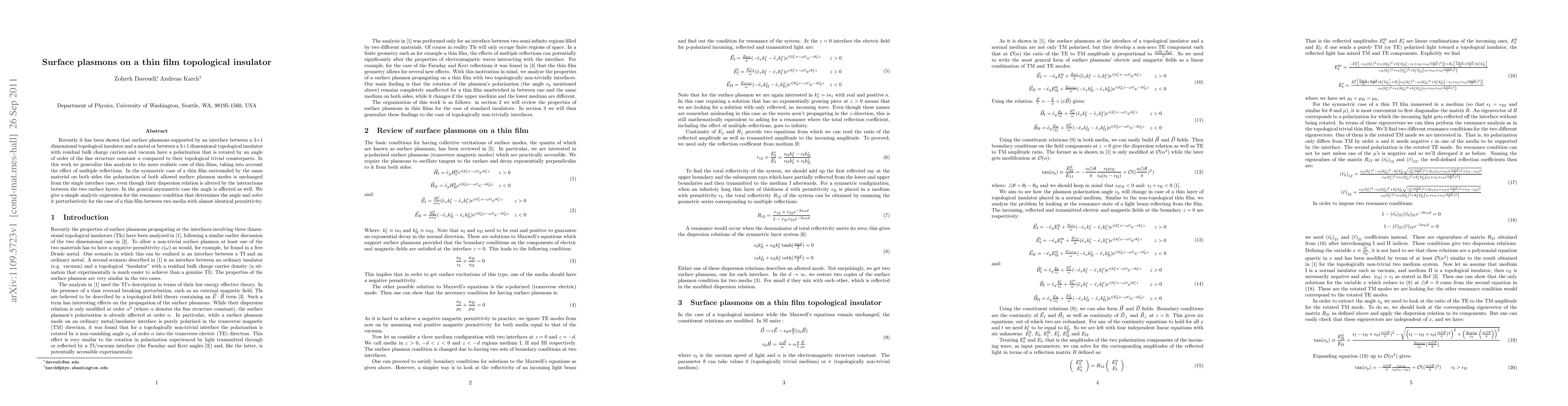 Recently it has been shown that surface plasmons supported by an interface between a 3+1 dimensional topological insulator and a metal or between a 3+1 dimensional topological insulator with residual bulk charge carriers and vacuum have a polarization that is rotated by an angle of order of the fine structure constant alpha compared to their topological trivial counterparts. In this work we generalize this analysis to the more realistic case of thin films, taking into account the effect of multiple reflections. In the symmetric case of a thin film surrounded by the same material on both sides the polarization of both allowed surface plasmon modes is unchanged from the single interface case, even though their dispersion relation is altered by the interactions between the two surface layers. In the general asymmetric case the angle is affected as well. We give a simple analytic expression for the resonance condition that determines the angle and solve it perturbatively for the case of a thin film between two media with almost identical permittivity.