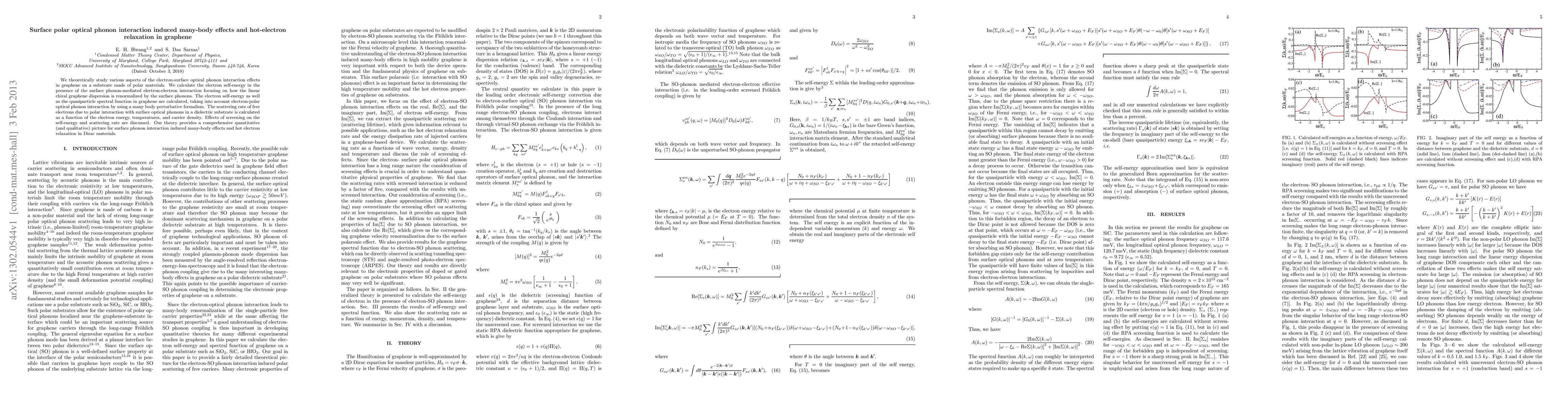 The paper presents a detailed theoretical analysis of electron-surface optical phonon interaction in graphene, including self-energy calculations, spectral functions, and scattering rates, using a many-body perturbative formalism.