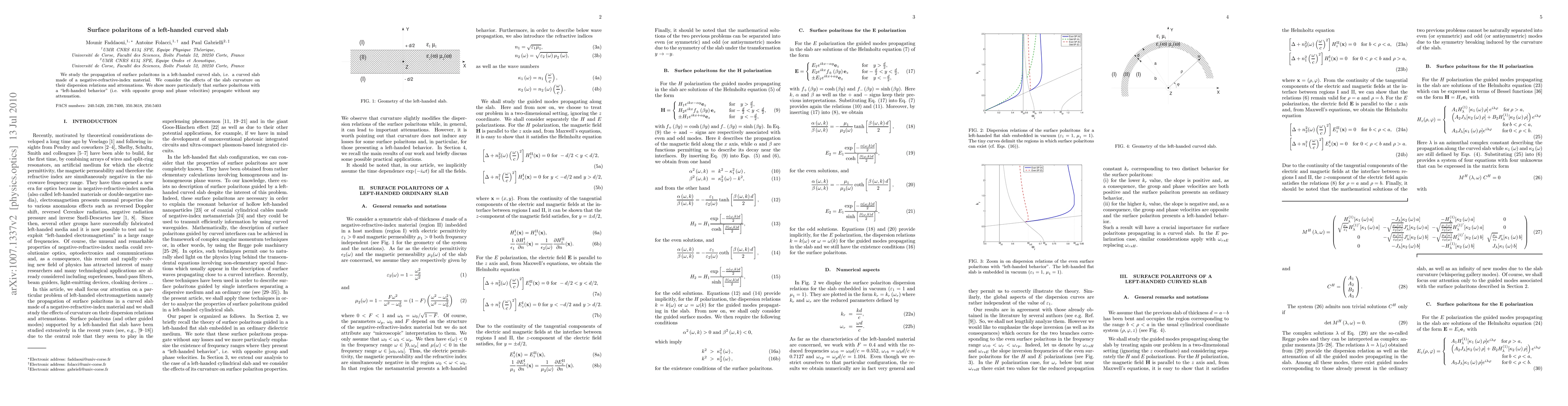 We study the propagation of surface polaritons in a left-handed curved slab, i.e. a curved slab made of a negative-refractive-index material. We consider the effects of the slab curvature on their dispersion relations and attenuations. We show more particularly that surface polaritons with a "left-handed behavior" (i.e. with opposite group and phase velocities) propagate without any attenuation.