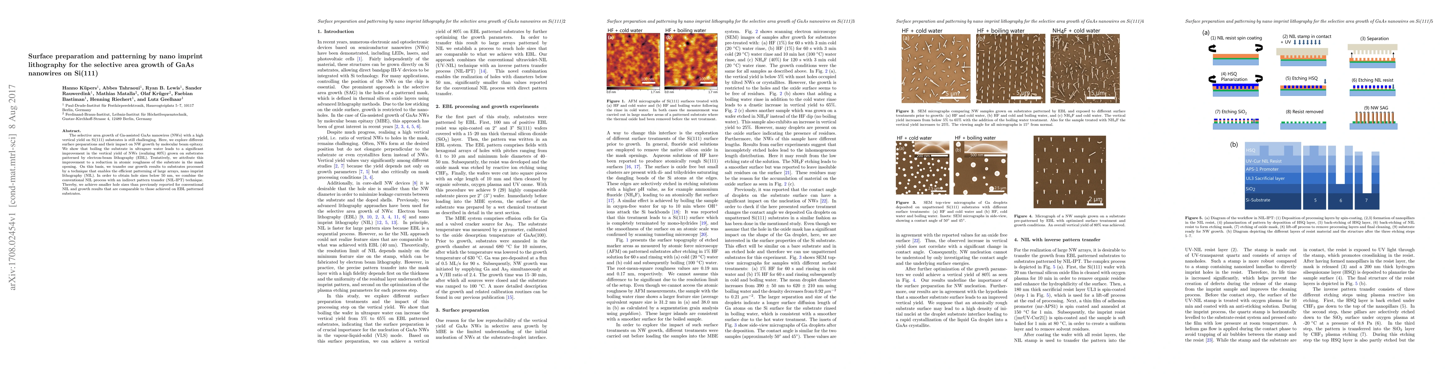 The selective area growth of Ga-assisted GaAs nanowires (NWs) with a high vertical yield on Si(111) substrates is still challenging. Here, we explore different surface preparations and their impact on NW growth by molecular beam epitaxy. We show that boiling the substrate in ultrapure water leads to a significant improvement in the vertical yield of NWs (realizing 80%) grown on substrates patterned by electron-beam lithography (EBL). Tentatively, we attribute this improvement to a reduction in atomic roughness of the substrate in the mask opening. On this basis, we transfer our growth results to substrates processed by a technique that enables the efficient patterning of large arrays, nano imprint lithography (NIL). In order to obtain hole sizes below 50 nm, we combine the conventional NIL process with an indirect pattern transfer (NIL-IPT) technique. Thereby, we achieve smaller hole sizes than previously reported for conventional NIL and growth results that are comparable to those achieved on EBL patterned substrates.