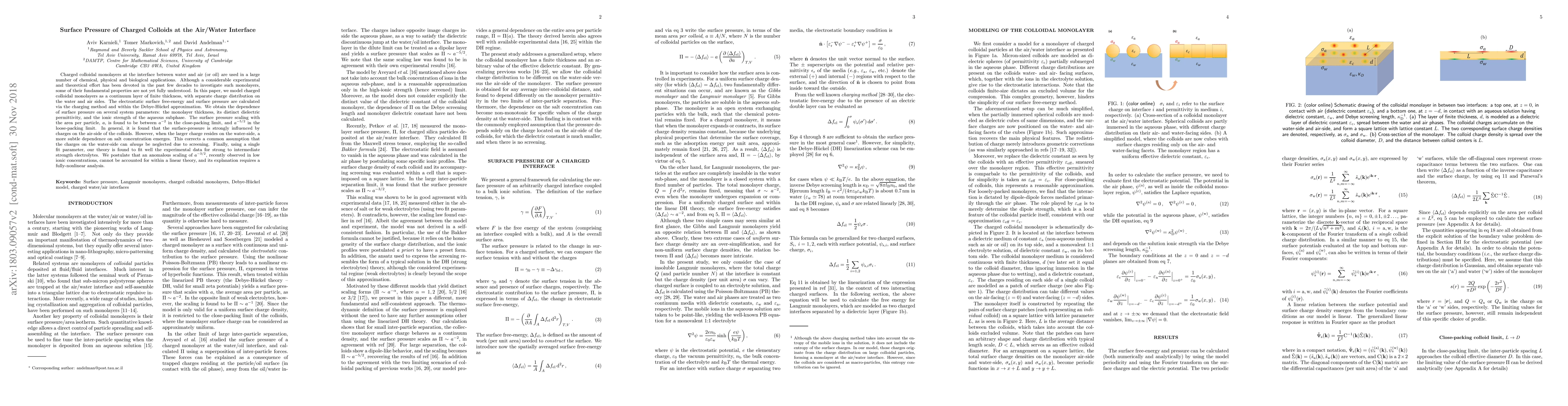 This paper models charged colloidal monolayers at the air/water interface, calculating surface pressure via electrostatics and the Debye-Hückel approximation. It finds that surface pressure depends on monolayer thickness, dielectric permittivity, and ionic strength, with a scaling between $a^{-2}$ and $a^{-5/2}$ based on packing density, and highlights the influence of air-side charges on surface pressure.