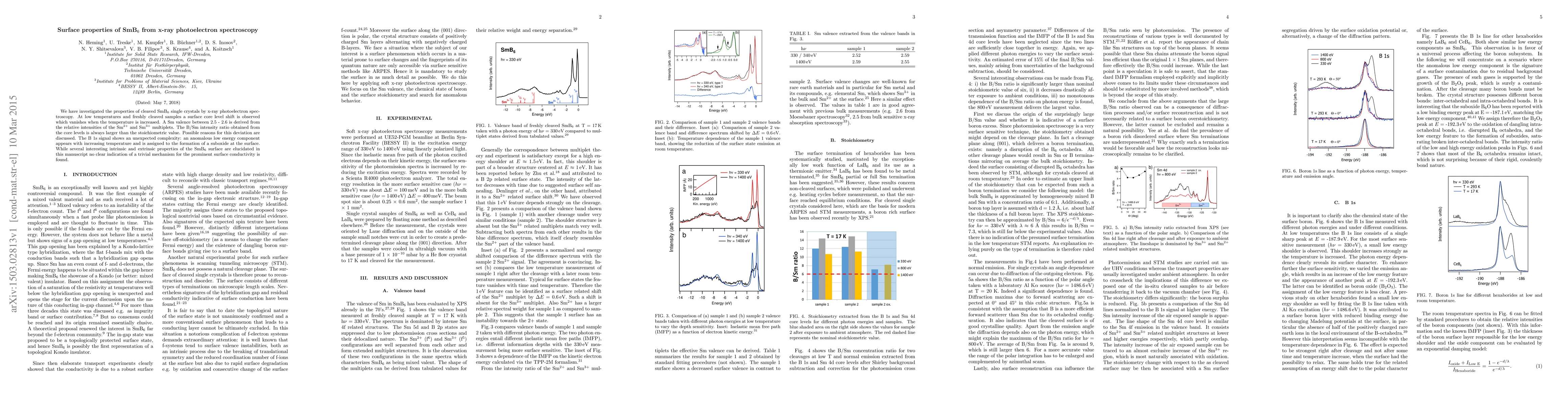 We have investigated the properties of cleaved SmB$_6$ single crystals by x-ray photoelectron spectroscopy. At low temperatures and freshly cleaved samples a surface core level shift is observed which vanishes when the temperature is increased. A Sm valence between 2.5 - 2.6 is derived from the relative intensities of the Sm$^{2+}$ and Sm$^{3+}$ multiplets. The B/Sm intensity ratio obtained from the core levels is always larger than the stoichiometric value. Possible reasons for this deviation are discussed. The B $1s$ signal shows an unexpected complexity: an anomalous low energy component appears with increasing temperature and is assigned to the formation of a suboxide at the surface. While several interesting intrinsic and extrinsic properties of the SmB$_6$ surface are elucidated in this manuscript no clear indication of a trivial mechanism for the prominent surface conductivity is found.