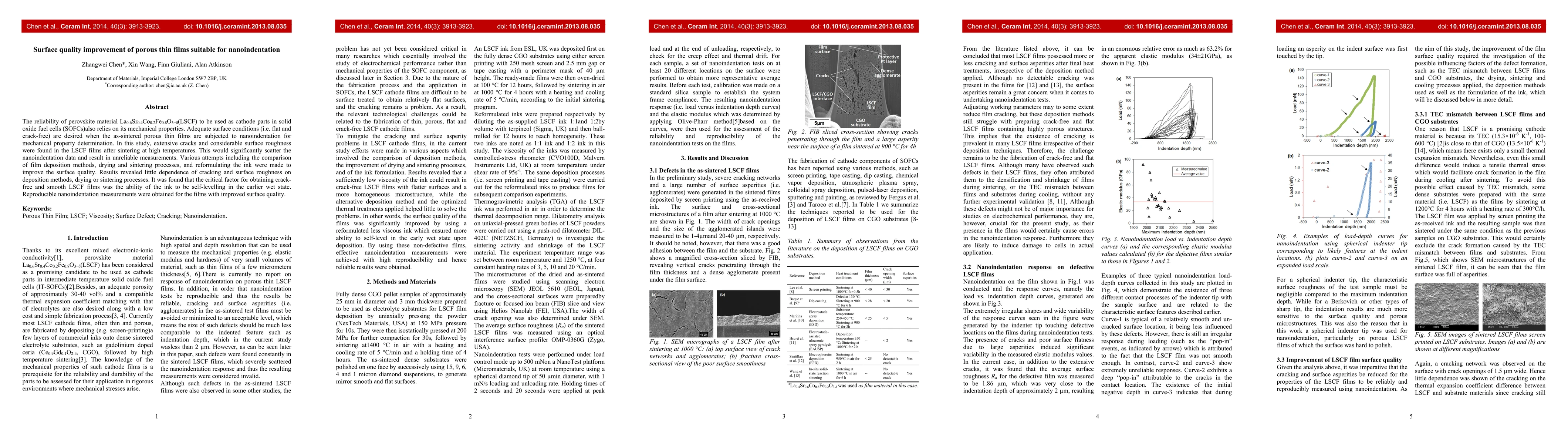 The reliability of perovskite material LSCF to be used as cathode parts in solid oxide fuel cells also relies on its mechanical properties. Adequate surface conditions are desired when the as-sintered porous thin films are subjected to nanoindentation for mechanical property determination. In this study, extensive cracks and considerable surface roughness were found in the LSCF films after sintering at high temperatures. This would significantly scatter the nanoindentation data and result in unreliable measurements. Various attempts including the comparison of film deposition methods, drying and sintering processes, and reformulating the ink were made to improve the surface quality. Results revealed little dependence of cracking and surface roughness on deposition methods, drying or sintering processes. It was found that the critical factor for obtaining crack-free and smooth LSCF films was the ability of the ink to be self-levelling in the earlier wet state. Reproducible nanoindentation measurements were obtained for the films with improved surface quality.