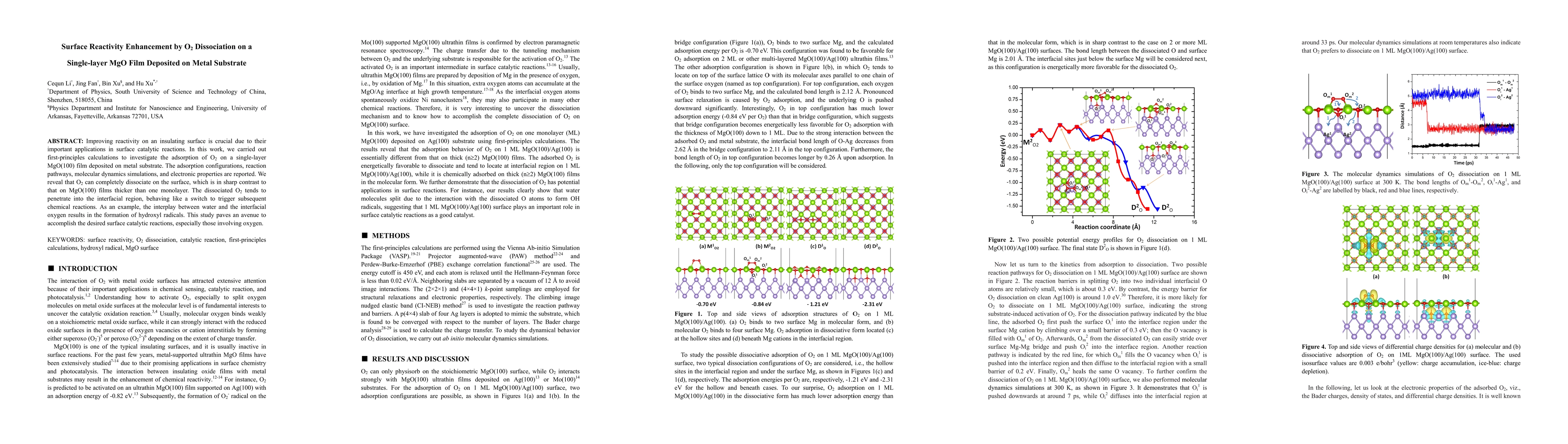 This study uses first-principles calculations to show that O2 can fully dissociate on a single-layer MgO film on a metal substrate, contrasting with thicker films. The dissociated oxygen triggers subsequent reactions, such as forming hydroxyl radicals when interacting with water, enhancing surface reactivity for catalytic applications.