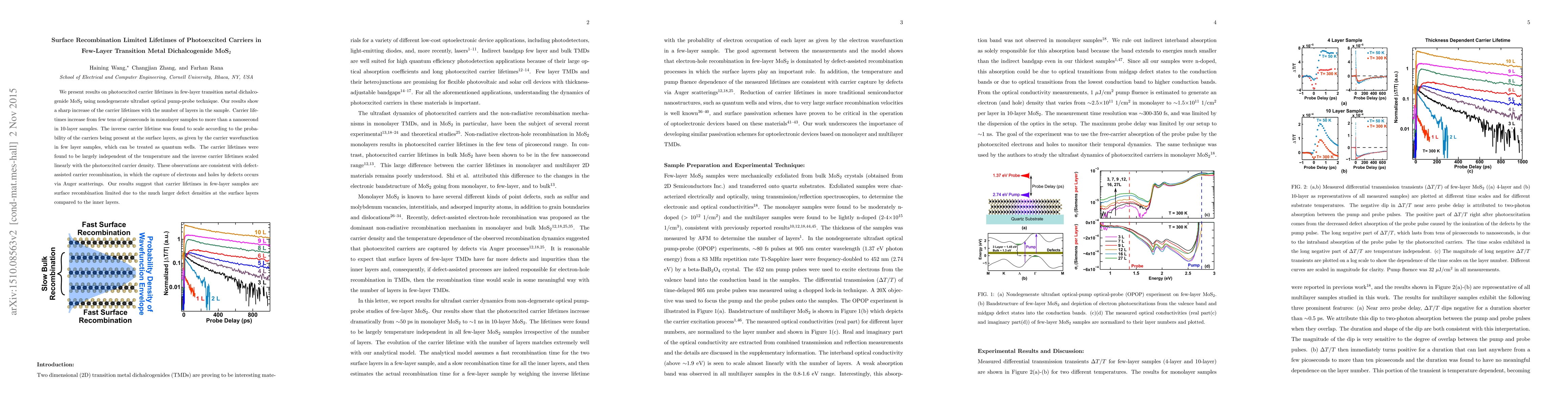 This study investigates the photoexcited carrier lifetimes in few-layer MoS2 using ultrafast optical techniques, revealing that lifetimes increase with the number of layers and are primarily limited by surface recombination due to higher defect densities at the surface. The results suggest that carrier recombination is defect-assisted and largely independent of temperature.