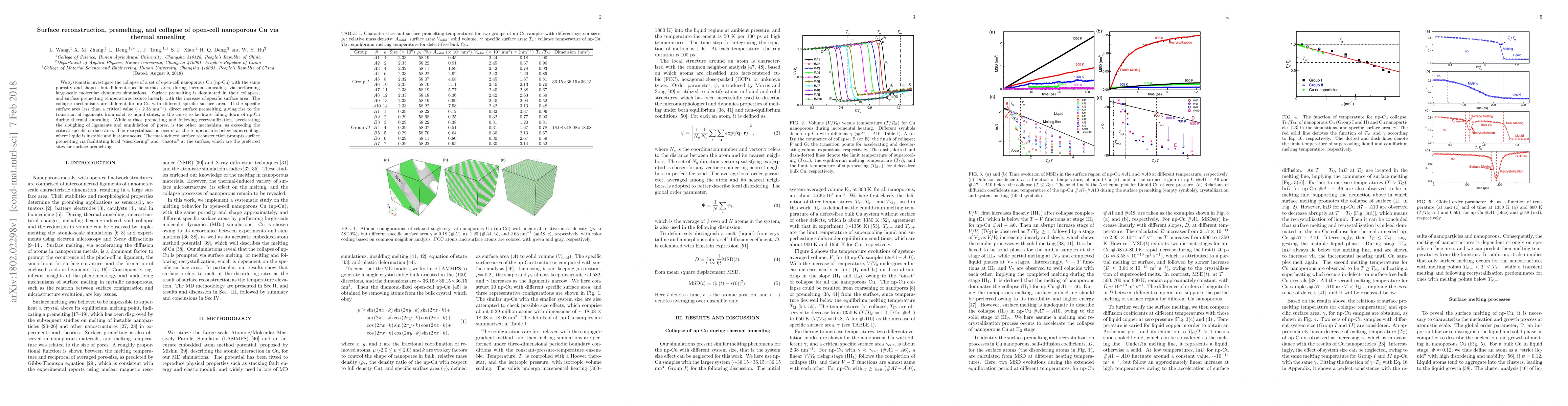 We systematic investigate the collapse of a set of open-cell nanoporous Cu (np-Cu) with the same porosity and shapes, but different specific surface area, during thermal annealing, via performing large-scale molecular dynamics simulations. Surface premelting is dominated in their collapses, and surface premelting temperatures reduce linearly with the increase of specific surface area. The collapse mechanisms are different for np-Cu with different specific surface area. If the specific surface area less than a critical value ($\sim$ 2.38 nm$^{-1}$), direct surface premelting, giving rise to the transition of ligaments from solid to liquid states, is the cause to facilitate falling-down of np-Cu during thermal annealing. While surface premelting and following recrystallization, accelerating the sloughing of ligaments and annihilation of pores, is the other mechanism, as exceeding the critical specific surface area. The recrystallization occurs at the temperatures below supercooling, where liquid is instable and instantaneous. Thermal-induced surface reconstruction prompts surface premelting via facilitating local "disordering" and "chaotic" at the surface, which are the preferred sites for surface premelting.