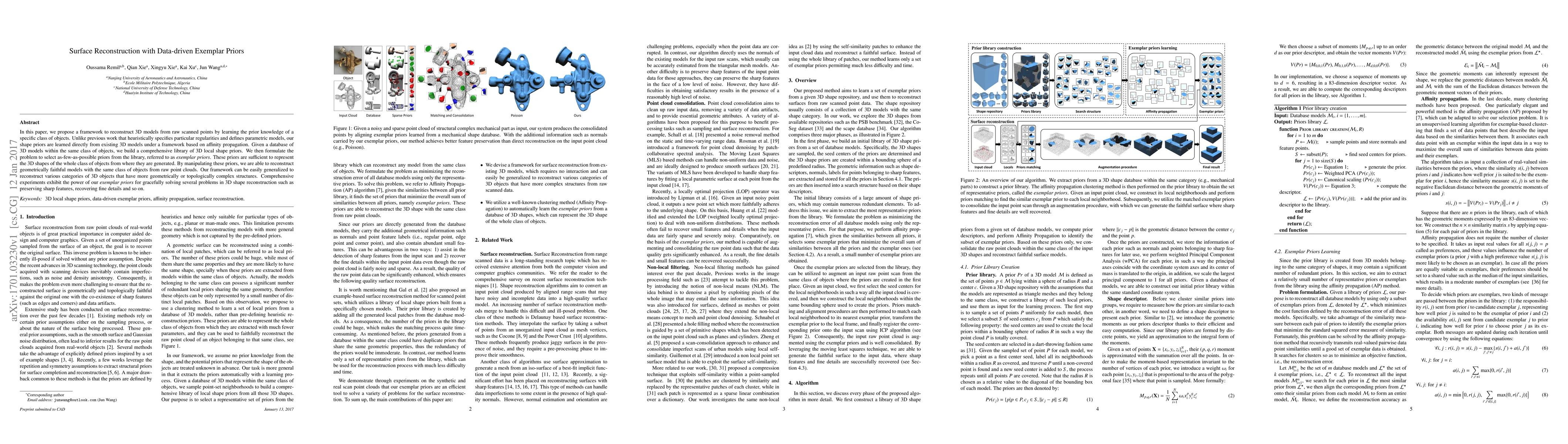 This paper introduces a framework for reconstructing 3D models from scanned points by learning data-driven exemplar priors from a database of 3D models. The proposed method uses affinity propagation to identify and utilize the most representative local shape priors for accurate and detailed reconstruction.