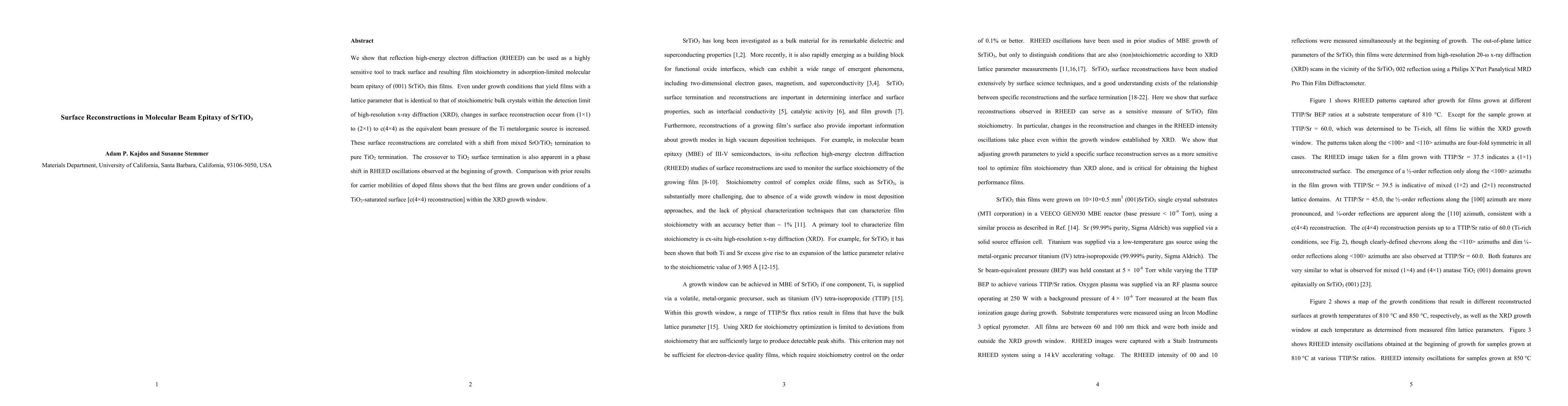 This study demonstrates that RHEED effectively monitors surface reconstructions and film stoichiometry during the molecular beam epitaxy of SrTiO3, revealing transitions from (1x1) to (2x1) to c(4x4) as Ti source pressure increases, correlating with shifts from mixed to pure TiO2 termination. Optimal film quality is achieved under TiO2-saturated conditions (c(4x4) reconstruction).