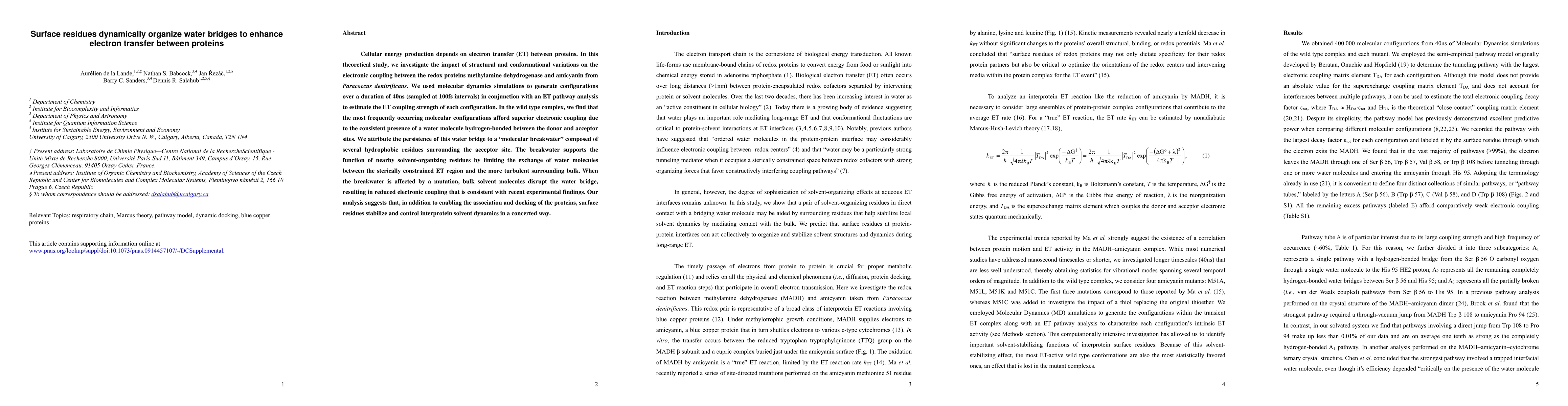 This study reveals that surface residues dynamically organize water bridges to enhance electron transfer between methylamine dehydrogenase and amicyanin. The hydrophobic "molecular breakwater" stabilizes these water bridges, crucial for maintaining optimal electronic coupling, which is disrupted by mutations.