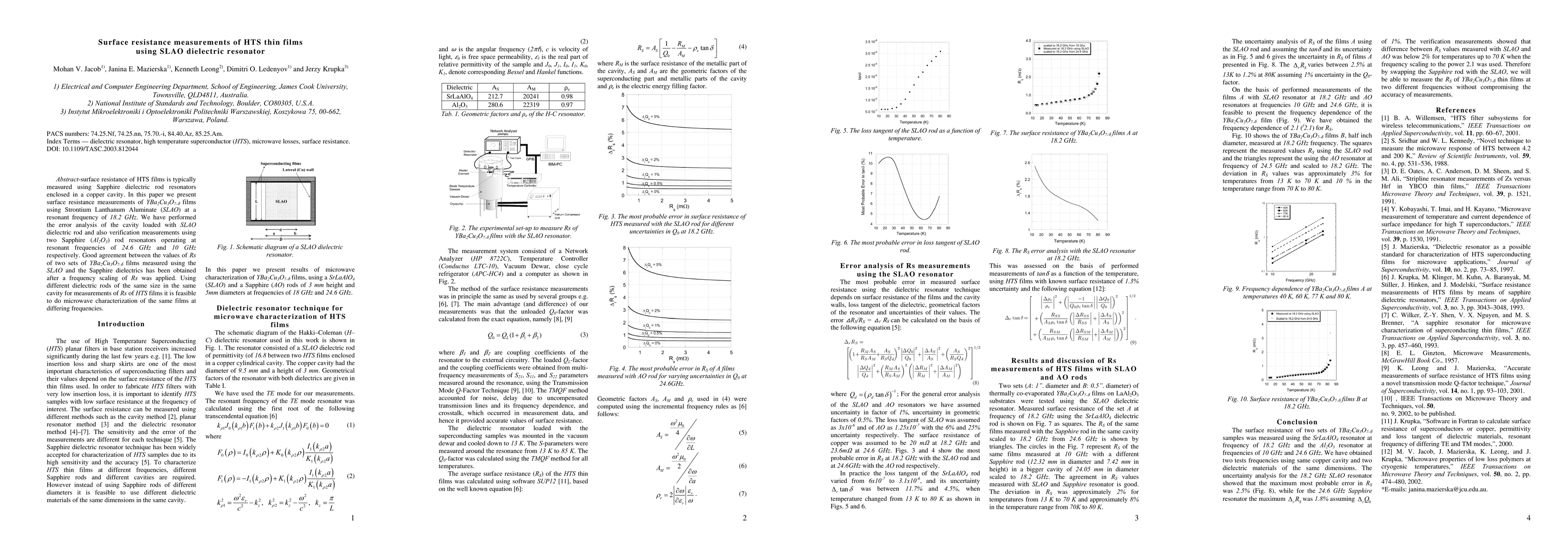 This paper measures the surface resistance of YBa2Cu3O7-{\delta} HTS films using Strontium Lanthanum Aluminate (SLAO) dielectric resonators at 18.2 GHz, demonstrating good agreement with Sapphire measurements after frequency scaling. It concludes that different dielectric rods can enable microwave characterization of HTS films at various frequencies.