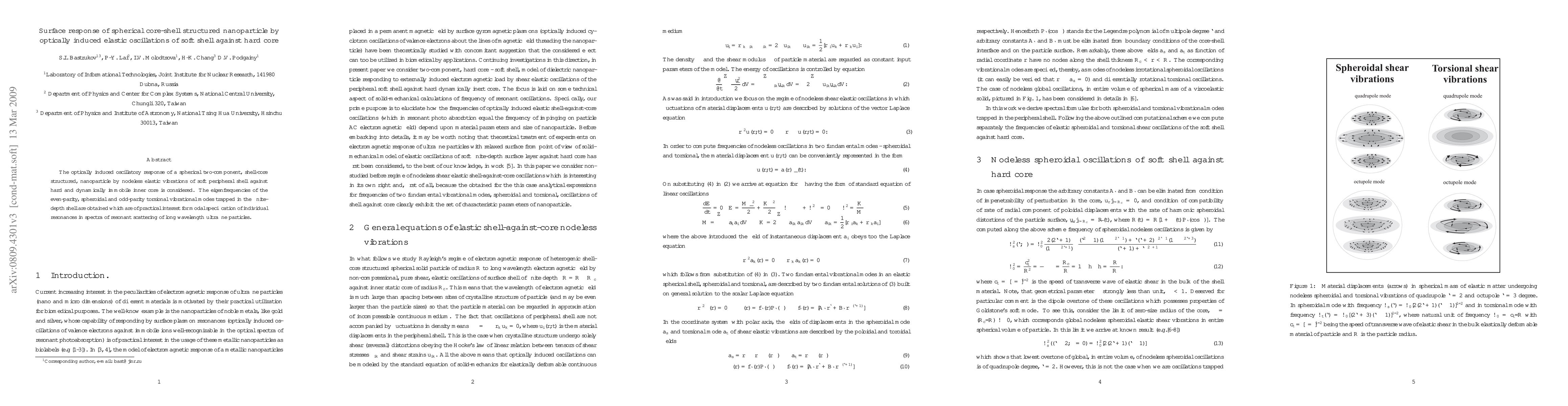 The optically induced oscillatory response of a spherical two-component, shell-core structured, nanoparticle by nodeless elastic vibrations of soft peripheral shell against hard and dynamically immobile inner core is considered. The eigenfrequencies of the even-parity, spheroidal and odd-parity torsional vibrational modes trapped in the finite-depth shell are obtained which are of practical interest for modal specification of individual resonances in spectra of resonant scattering of long wavelength electromagnetic waves by ultrafine particles.