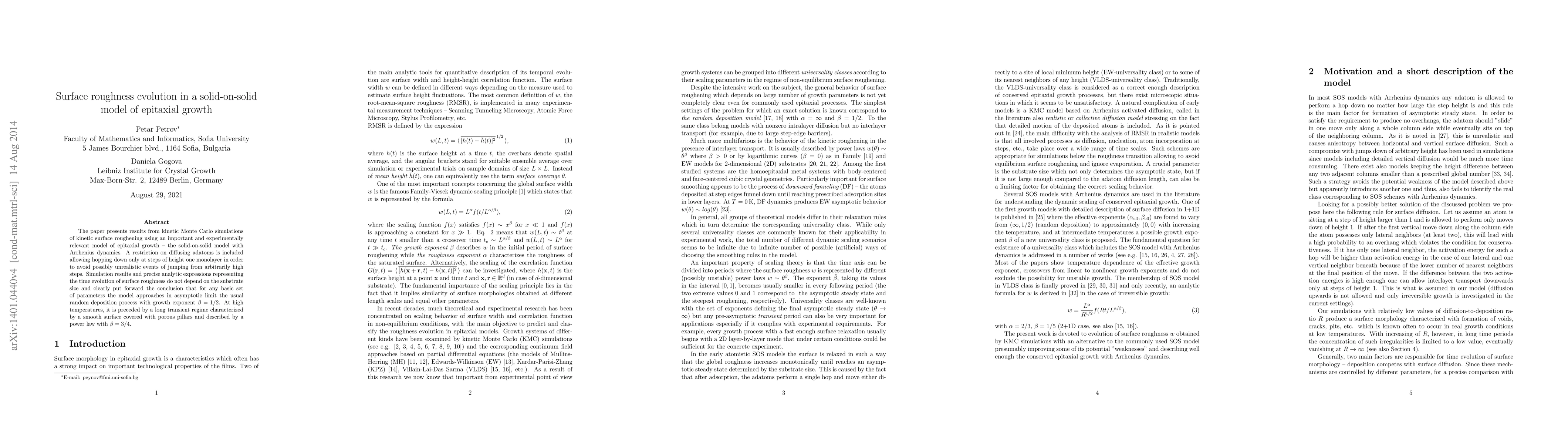This paper uses kinetic Monte Carlo simulations to study the surface roughness evolution in a solid-on-solid epitaxial growth model, finding that the model approaches a random deposition process with a growth exponent of $\beta=1/2$ in the asymptotic limit, preceded by a transient regime with $\beta=3/4$ at high temperatures.