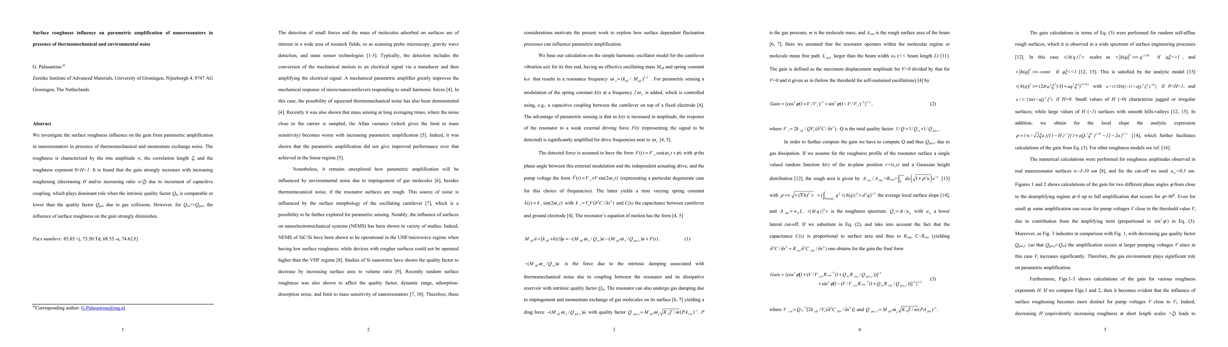 This paper examines how surface roughness affects parametric amplification in nanoresonators amidst thermomechanical and momentum exchange noise. Increased roughness enhances gain due to greater capacitive coupling, especially when intrinsic quality factors are low compared to those from gas collisions. However, the effect diminishes when intrinsic quality factors are much higher.