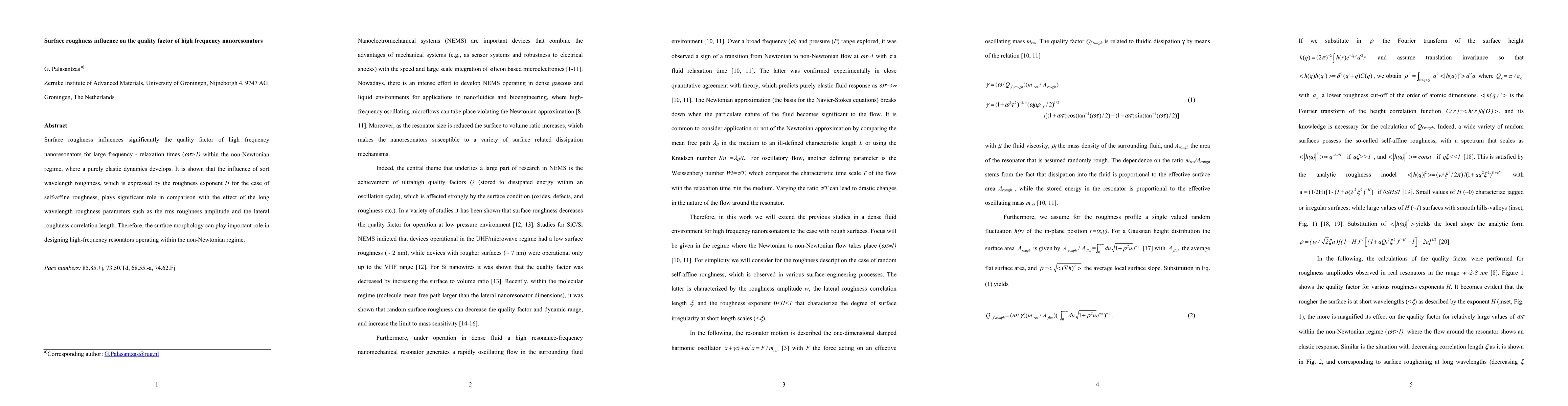 This study investigates how surface roughness, particularly short wavelength roughness characterized by the roughness exponent H, significantly impacts the quality factor of high-frequency nanoresonators in the non-Newtonian regime. The findings suggest that short wavelength roughness plays a more critical role than long wavelength parameters, emphasizing the importance of surface morphology in designing such resonators.