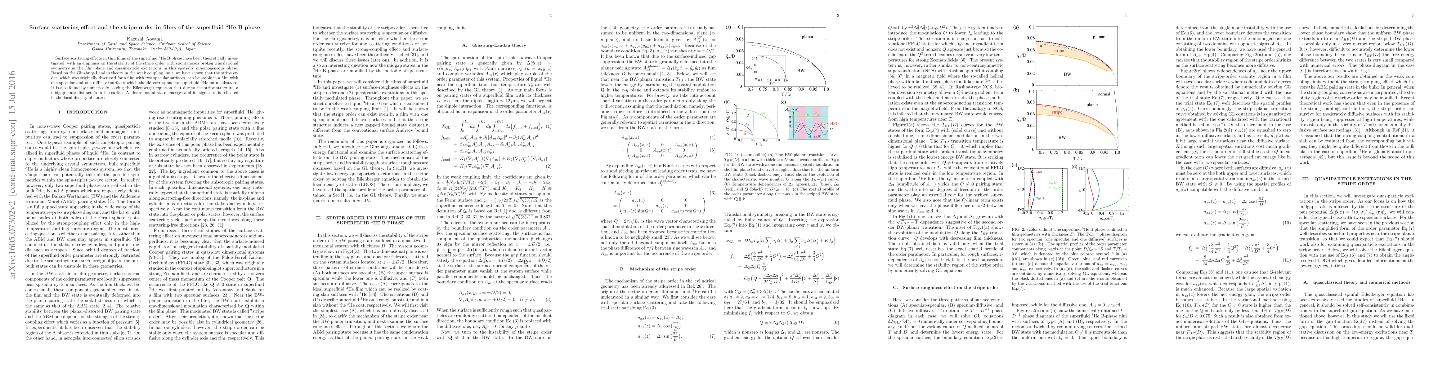 This paper investigates the stability of stripe order in thin films of superfluid 3He B phase, focusing on surface scattering effects. It demonstrates that the stripe order remains stable even with one specular and one diffusive surface, and identifies a midgap state emerging due to the stripe structure, which is reflected in the local density of states.