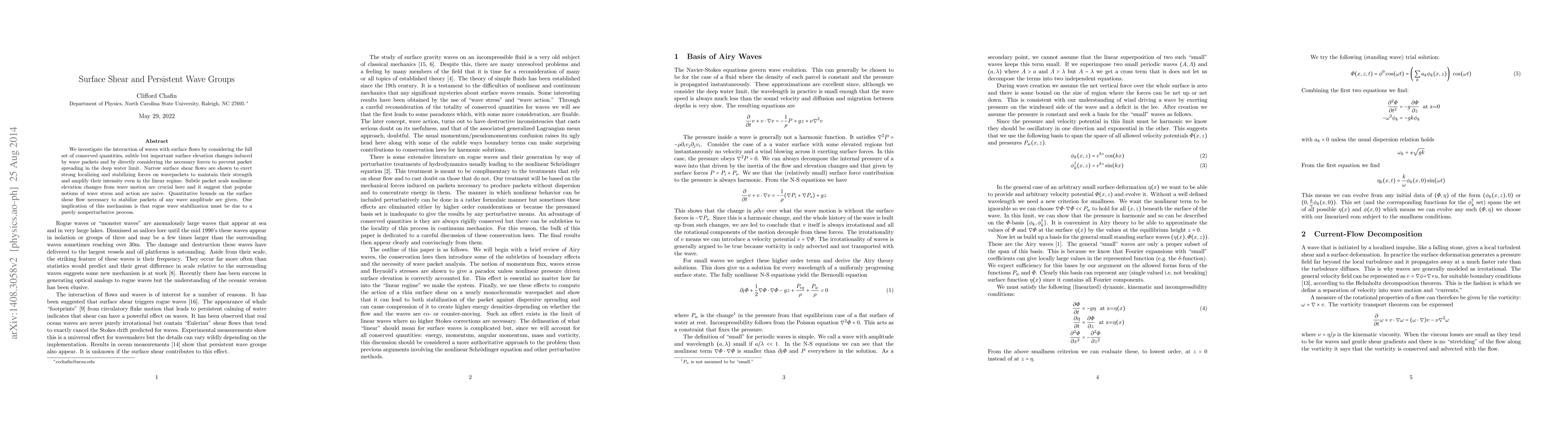 We investigate the interaction of waves with surface flows by considering the full set of conserved quantities, subtle but important surface elevation changes induced by wave packets and by directly considering the necessary forces to prevent packet spreading in the deep water limit. Narrow surface shear flows are shown to exert strong localizing and stabilizing forces on wavepackets to maintain their strength and amplify their intensity even in the linear regime. Subtle packet scale nonlinear elevation changes from wave motion are crucial here and it suggest that popular notions of wave stress and action are naive. Quantitative bounds on the surface shear flow necessary to stabilize packets of any wave amplitude are given. One implication of this mechanism is that rogue wave stabilization must be due to a purely nonperturbative process.