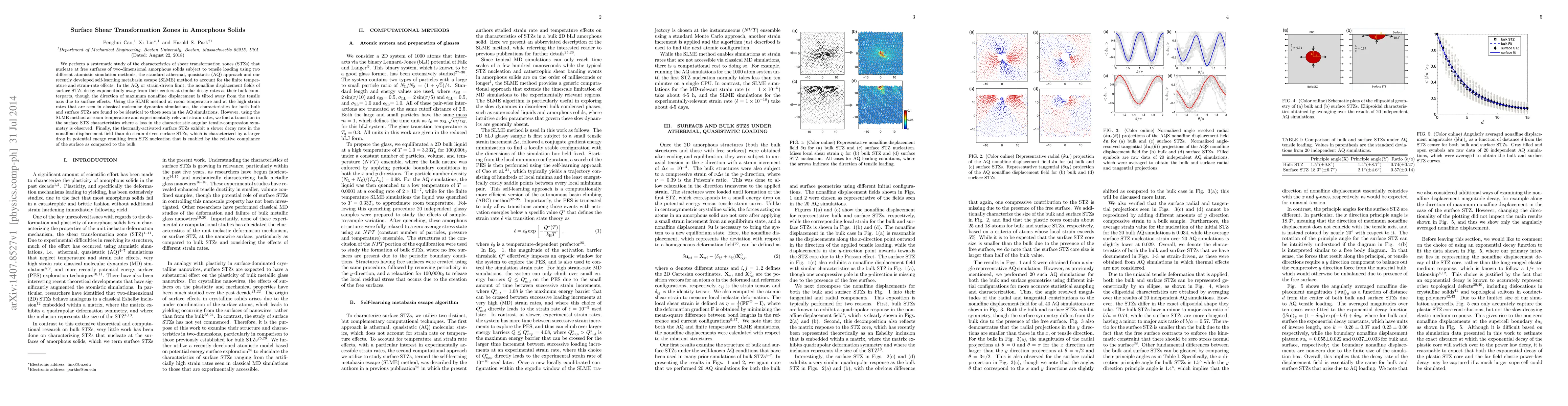Researchers studied surface shear transformation zones in amorphous solids under tensile loading using two simulation methods, finding that thermally-activated zones exhibit slower decay rates due to the relative compliance of the surface compared to the bulk.