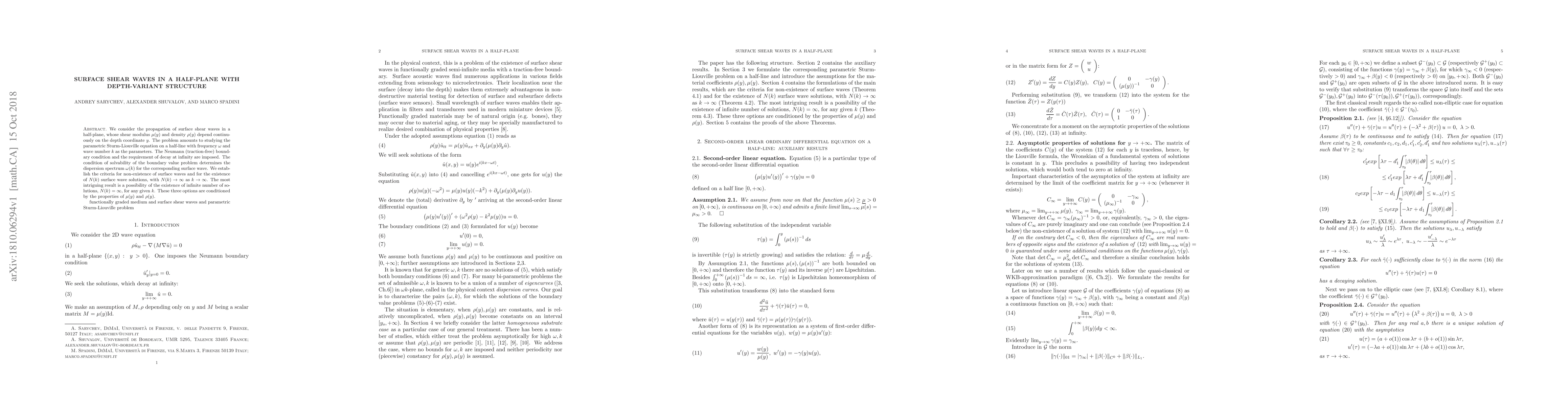 Researchers studied surface shear waves in a half-plane with varying depth-dependent structure, finding conditions for wave existence and infinite solutions under specific properties of the medium.