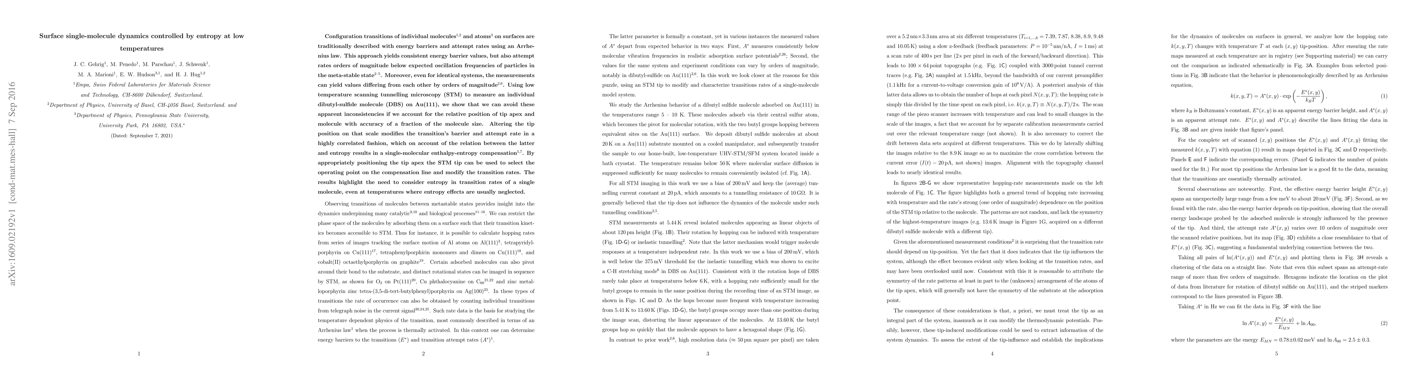 Configuration transitions of individual molecules and atoms on surfaces are traditionally described with energy barriers and attempt rates using an Arrhenius law. This approach yields consistent energy barrier values, but also attempt rates orders of magnitude below expected oscillation frequencies of particles in the meta-stable state. Moreover, even for identical systems, the measurements can yield values differing from each other by orders of magnitude. Using low temperature scanning tunnelling microscopy (STM) to measure an individual dibutyl-sulfide molecule (DBS) on Au(111), we show that we can avoid these apparent inconsistencies if we account for the relative position of tip apex and molecule with accuracy of a fraction of the molecule size. Altering the tip position on that scale modifies the transition's barrier and attempt rate in a highly correlated fashion, which on account of the relation between the latter and entropy results in a single-molecular enthalpy-entropy compensation. By appropriately positioning the tip apex the STM tip can be used to select the operating point on the compensation line and modify the transition rates. The results highlight the need to consider entropy in transition rates of a single molecule, even at temperatures where entropy effects are usually neglected.