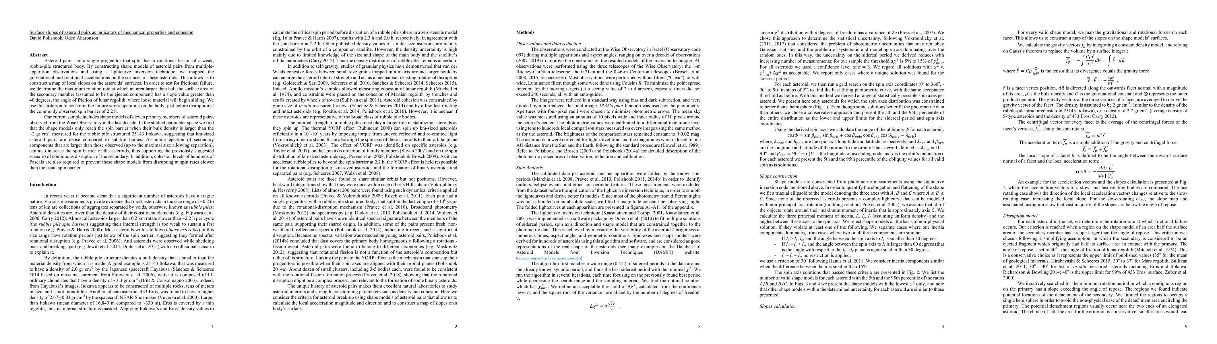 Asteroid pairs had a single progenitor that split due to rotational-fission of a weak, rubble-pile structured body. By constructing shape models of asteroid pairs from multiple-apparition observations and using a lightcurve inversion technique, we mapped the gravitational and rotational accelerations on the surfaces of these asteroids. This allows us to construct a map of local slopes on the asteroids' surfaces. In order to test for frictional failure, we determine the maximum rotation rate at which an area larger than half the surface area of the secondary member (assumed to be the ejected component) has a slope value greater than 40 degrees, the angle of friction of lunar regolith, where loose material will begin sliding. We use this criterion to constrain the failure stress operating on the body, just before disruption at the commonly observed spin barrier of 2.2 h. Our current sample includes shape models of eleven primary members of asteroid pairs, observed from the Wise Observatory in the last decade. In the studied parameter space we find that the shape models only reach the spin barrier when their bulk density is larger than the ~2 gr cm-3 measured for the rubble pile structured 25143 Itokawa, suggesting that km-sized asteroid pairs are dense compared to sub-km bodies. Assuming ejection of secondary components that are larger than those observed (up to the maximal size allowing separation), can also increase the spin barrier of the asteroids, thus supporting the previously suggested scenario of continuous disruption of the secondary. In addition, cohesion levels of hundreds of Pascals are also required to prevent these shape models from disrupting at spin rates slower than the usual spin barrier.