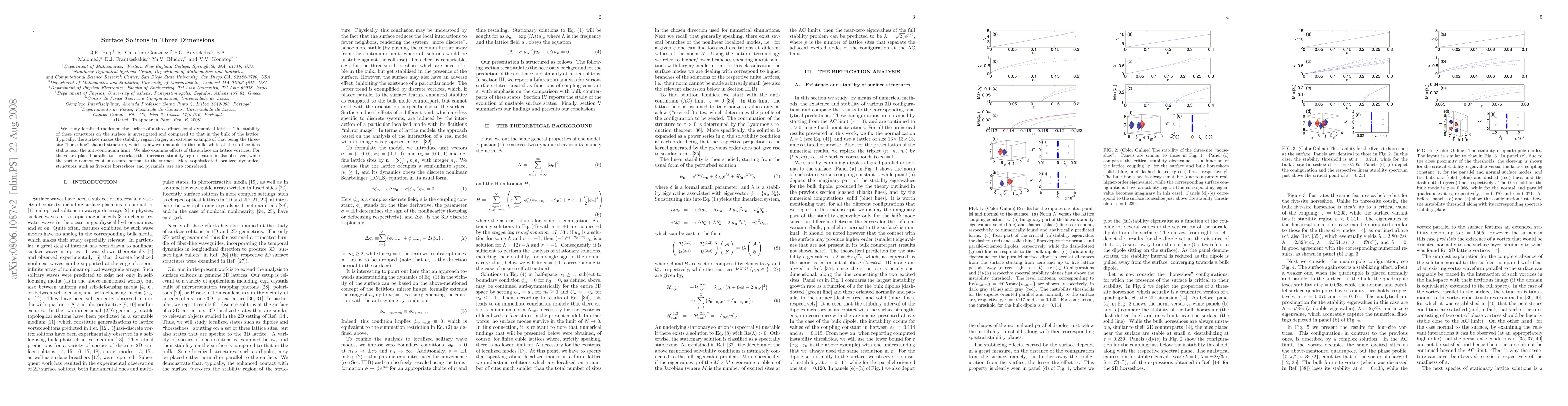 We study localized modes on the surface of a three-dimensional dynamical lattice. The stability of these structures on the surface is investigated and compared to that in the bulk of the lattice. Typically, the surface makes the stability region larger, an extreme example of that being the three-site "horseshoe"-shaped structure, which is always unstable in the bulk, while at the surface it is stable near the anti-continuum limit. We also examine effects of the surface on lattice vortices. For the vortex placed parallel to the surface this increased stability region feature is also observed, while the vortex cannot exist in a state normal to the surface. More sophisticated localized dynamical structures, such as five-site horseshoes and pyramids, are also considered.