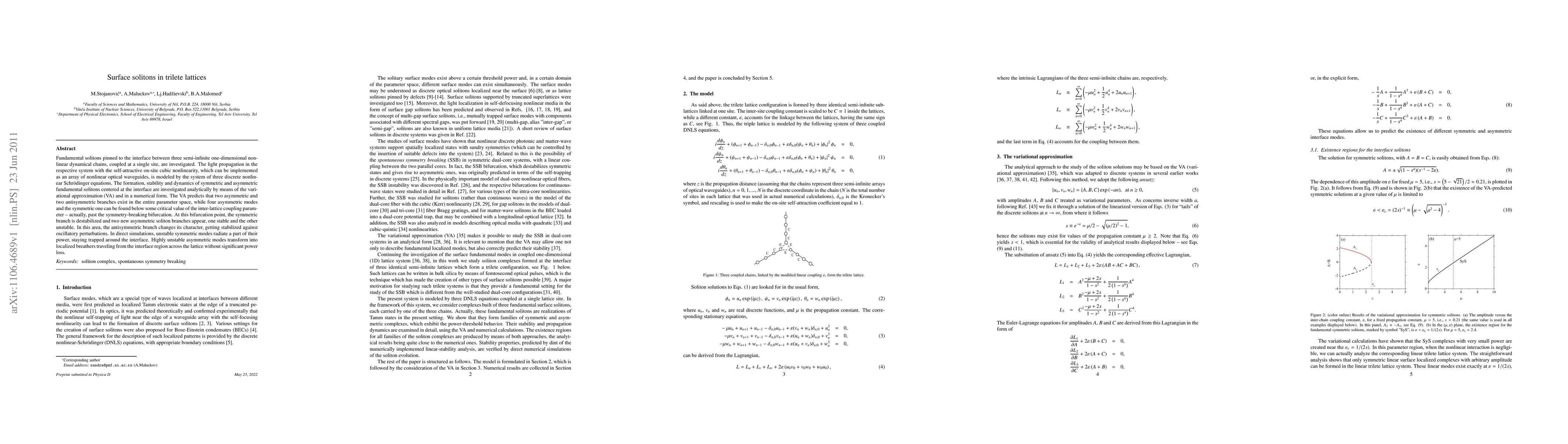 Fundamental solitons pinned to the interface between three semi-infinite one-dimensional nonlinear dynamical chains, coupled at a single site, are investigated. The light propagation in the respective system with the self-attractive on-site cubic nonlinearity, which can be implemented as an array of nonlinear optical waveguides, is modeled by the system of three discrete nonlinear Schr\"{o}dinger equations. The formation, stability and dynamics of symmetric and asymmetric fundamental solitons centered at the interface are investigated analytically by means of the variational approximation (VA) and in a numerical form. The VA predicts that two asymmetric and two antisymmetric branches exist in the entire parameter space, while four asymmetric modes and the symmetric one can be found below some critical value of the inter-lattice coupling parameter -- actually, past the symmetry-breaking bifurcation. At this bifurcation point, the symmetric branch is destabilized and two new asymmetric soliton branches appear, one stable and the other unstable. In this area, the antisymmetric branch changes its character, getting stabilized against oscillatory perturbations. In direct simulations, unstable symmetric modes radiate a part of their power, staying trapped around the interface. Highly unstable asymmetric modes transform into localized breathers traveling from the interface region across the lattice without significant power loss.
