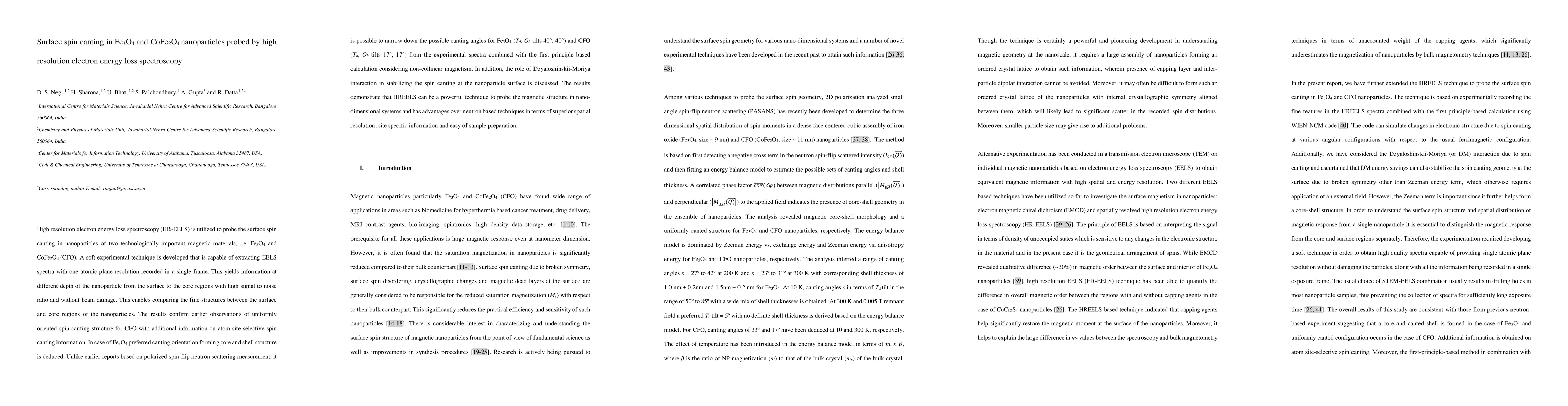 High resolution electron energy loss spectroscopy (HR-EELS) reveals surface spin canting in Fe3O4 and CoFe2O4 nanoparticles, providing atom site-selective spin canting information and precise canting angles. The technique offers superior spatial resolution and site-specific insights compared to neutron-based methods.