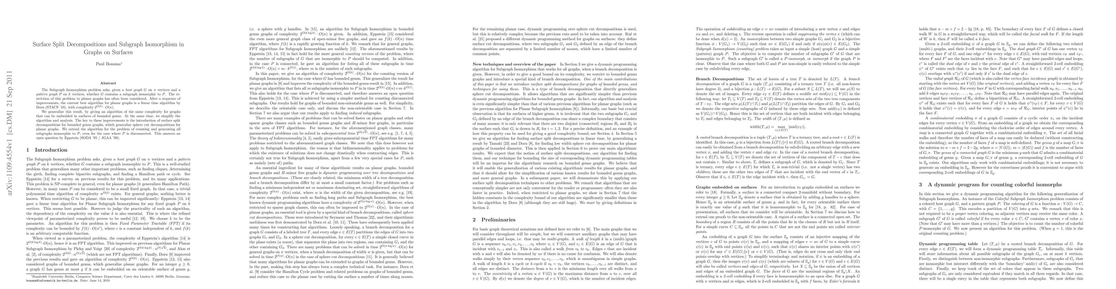 The Subgraph Isomorphism problem asks, given a host graph G on n vertices and a pattern graph P on k vertices, whether G contains a subgraph isomorphic to P. The restriction of this problem to planar graphs has often been considered. After a sequence of improvements, the current best algorithm for planar graphs is a linear time algorithm by Dorn (STACS '10), with complexity $2^{O(k)} O(n)$. We generalize this result, by giving an algorithm of the same complexity for graphs that can be embedded in surfaces of bounded genus. At the same time, we simplify the algorithm and analysis. The key to these improvements is the introduction of surface split decompositions for bounded genus graphs, which generalize sphere cut decompositions for planar graphs. We extend the algorithm for the problem of counting and generating all subgraphs isomorphic to P, even for the case where P is disconnected. This answers an open question by Eppstein (SODA '95 / JGAA '99).