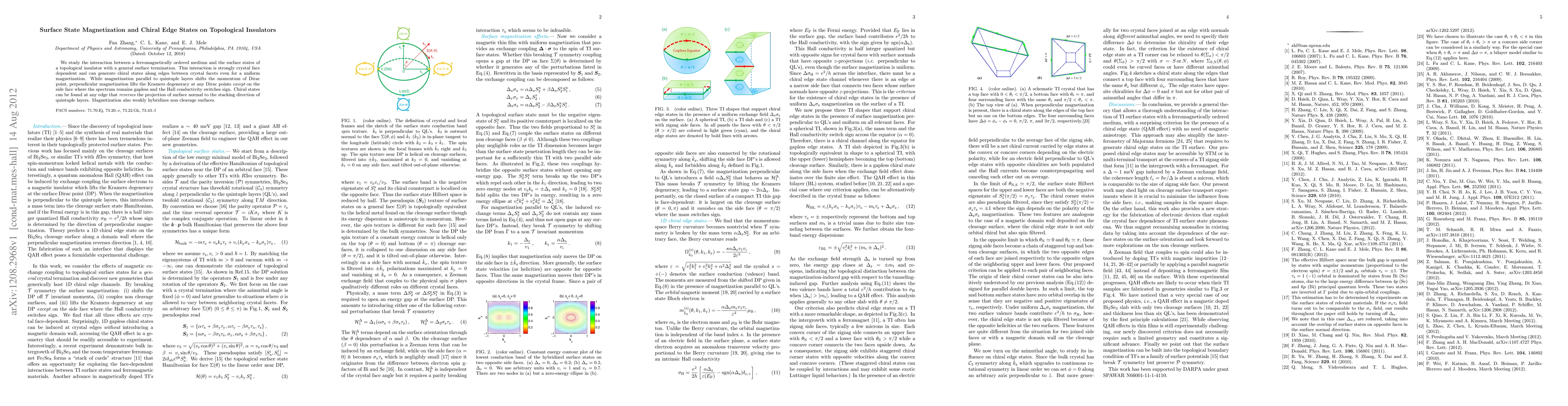 We study the interaction between a ferromagnetically ordered medium and the surface states of a topological insulator with a general surface termination. This interaction is strongly crystal face dependent and can generate chiral states along edges between crystal facets even for a uniform magnetization. While magnetization parallel to quintuple layers shifts the momentum of Dirac point, perpendicular magnetization lifts the Kramers degeneracy at any Dirac points except on the side face where the spectrum remains gapless and the Hall conductivity switches sign. Chiral states can be found at any edge that reverses the projection of surface normal to the stacking direction of quintuple layers. Magnetization also weakly hybridizes non cleavage surfaces.