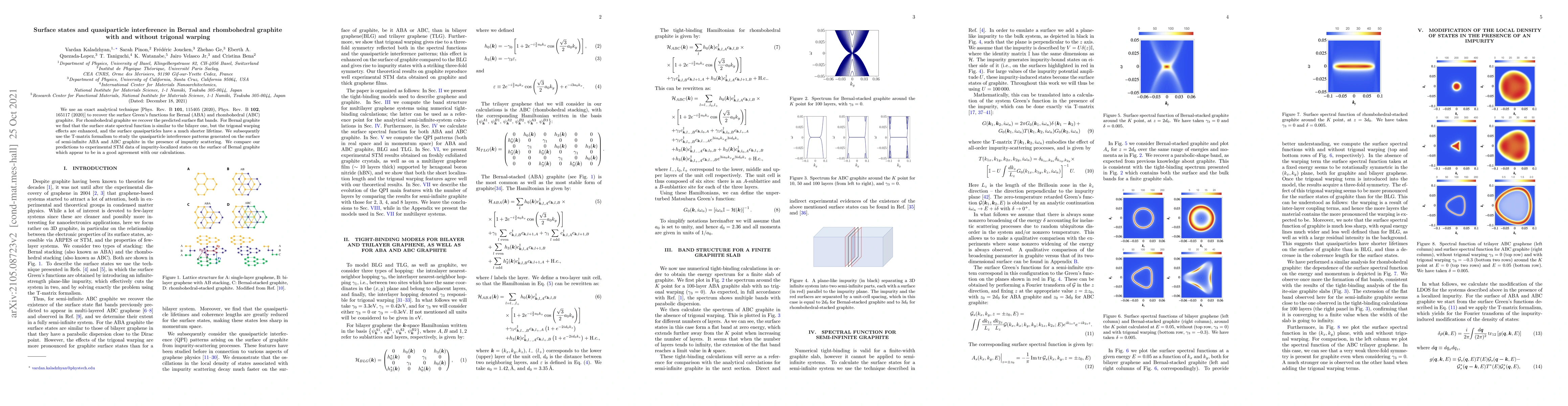 This paper uses an analytical technique to study surface states in Bernal and rhombohedral graphite, finding enhanced trigonal warping effects in Bernal graphite. It employs the T-matrix formalism to analyze quasiparticle interference patterns, showing good agreement with experimental STM data on impurity-localized states.