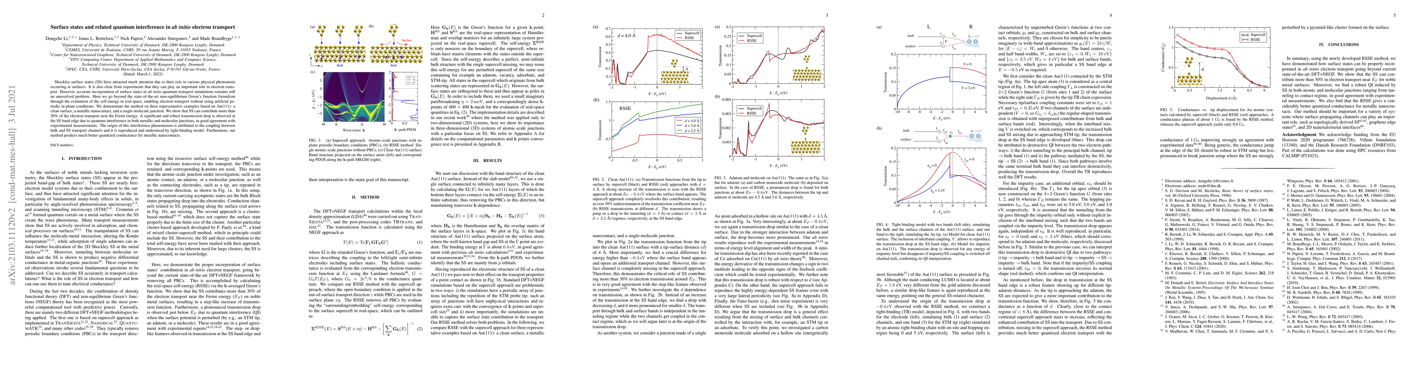 This paper presents an advanced method for incorporating surface states in ab initio quantum transport simulations, demonstrating significant quantum interference effects in electron transport near the Fermi energy, particularly in metallic and molecular junctions. The method shows that surface states can contribute over 30% to transport and predicts better quantized conductance for metallic nanocontacts.