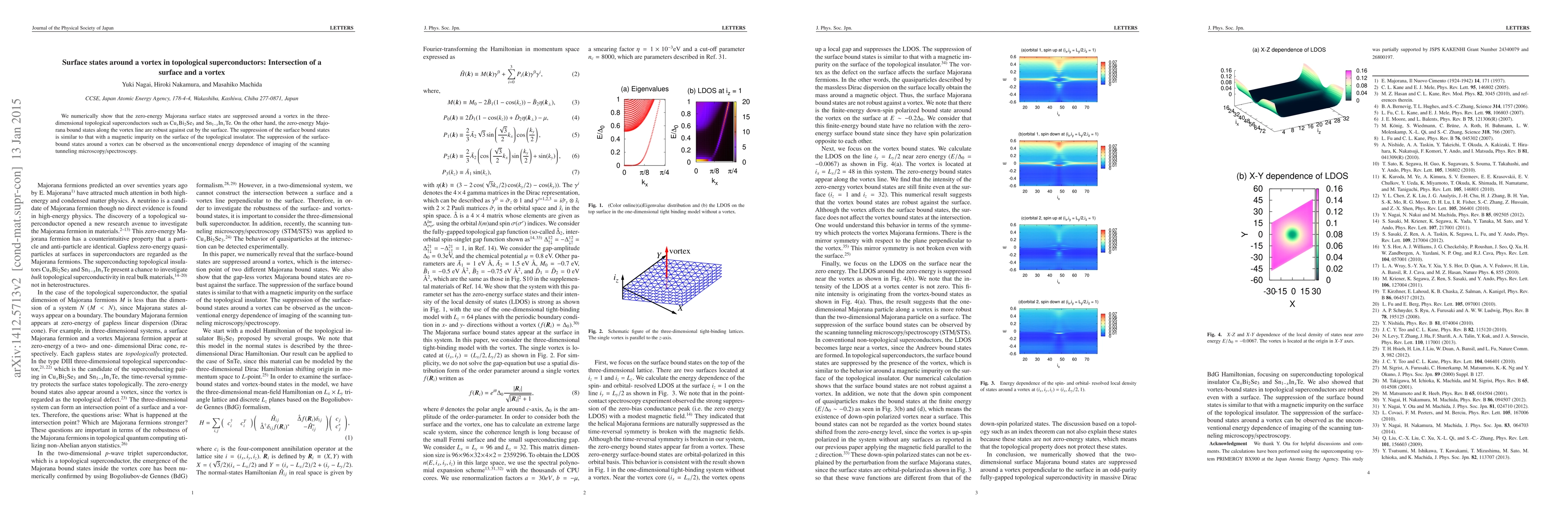 We numerically show that the zero-energy Majorana surface states are suppressed around a vortex in the three-dimensional topological superconductors such as Cu$_{x}$Bi$_{2}$Se$_{3}$ and Sn$_{1-x}$In$_{x}$Te. On the other hand, the zero-energy Majorana bound states along the vortex line are robust against cut by the surface. The suppression of the surface bound states is similar to that with a magnetic impurity on the surface of the topological insulator. The suppression of the surface-bound states around a vortex can be observed as the unconventional energy dependence of imaging of the scanning tunneling microscopy/spectroscopy.