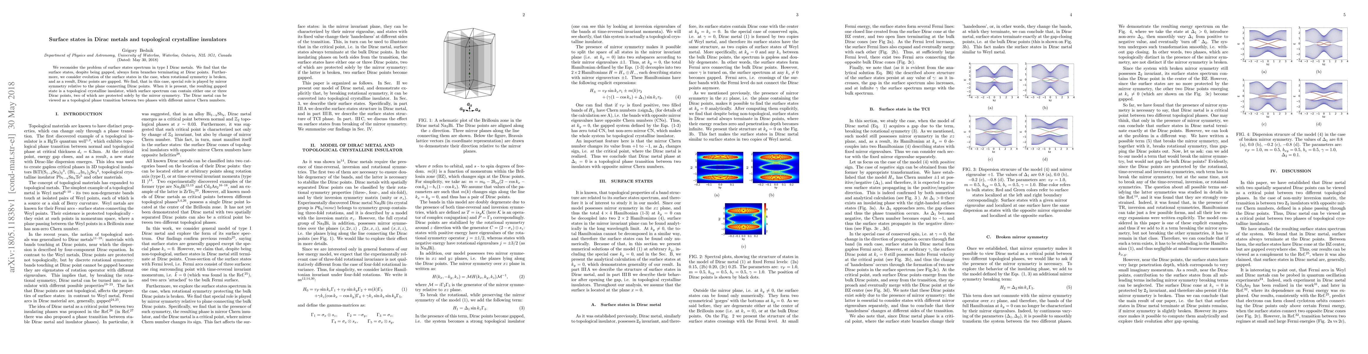 We reconsider the problem of surface states spectrum in type One Dirac metals. We find that the surface states, despite being gapped, always form branches terminating at Dirac points. Furthermore, we consider evolution of the surface states in the case, when rotational symmetry is broken, and as a result, Dirac points are gapped. We find, that in this case, special role is played by mirror symmetry relative to the plane connecting Dirac points. When it is present, the resulting gapped state is a topological crystalline insulator, which surface spectrum can contain either one or three Dirac points, two of which are protected solely by the mirror symmetry. Thus, the Dirac metal can be viewed as a topological phase transition between two phases with different mirror Chern numbers.