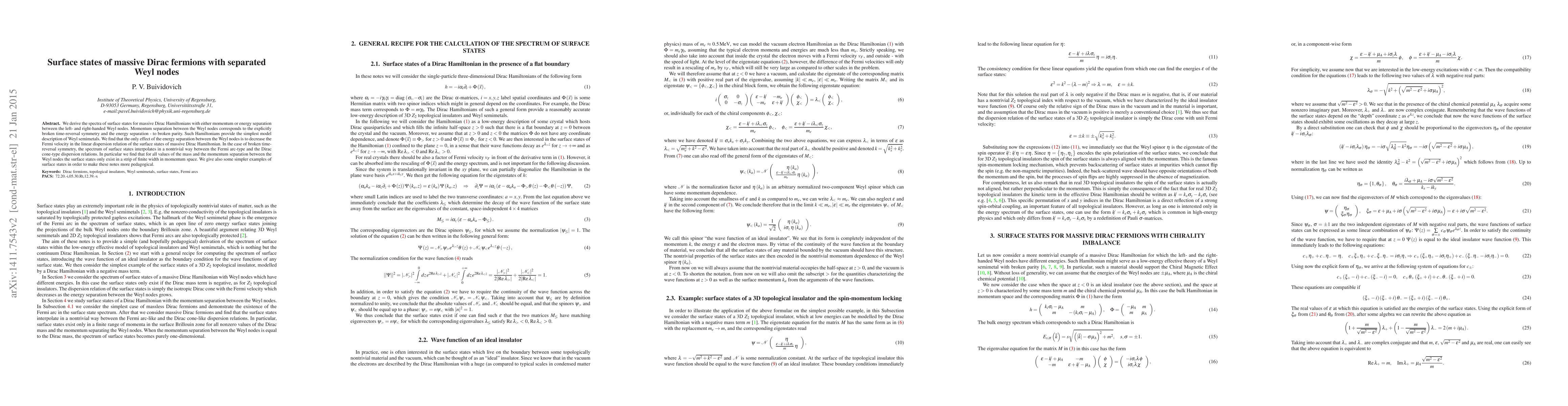 We derive the spectra of surface states for massive Dirac Hamiltonians with either momentum or energy separation between the left- and right-handed Weyl nodes. Momentum separation between the Weyl nodes corresponds to the explicitly broken time-reversal symmetry and the energy separation - to broken parity. Such Hamiltonians provide the simplest model description of Weyl semimetals. We find that the only effect of the energy separation between the Weyl nodes is to decrease the Fermi velocity in the linear dispersion relation of the surface states of massive Dirac Hamiltonian. In the case of broken time-reversal symmetry, the spectrum of surface states interpolates in a nontrivial way between the Fermi arc-type and the Dirac cone-type dispersion relations. In particular we find that for all values of the mass and the momentum separation between the Weyl nodes the surface states only exist in a strip of finite width in momentum space. We give also some simpler examples of surface states in order to make these notes more pedagogical.