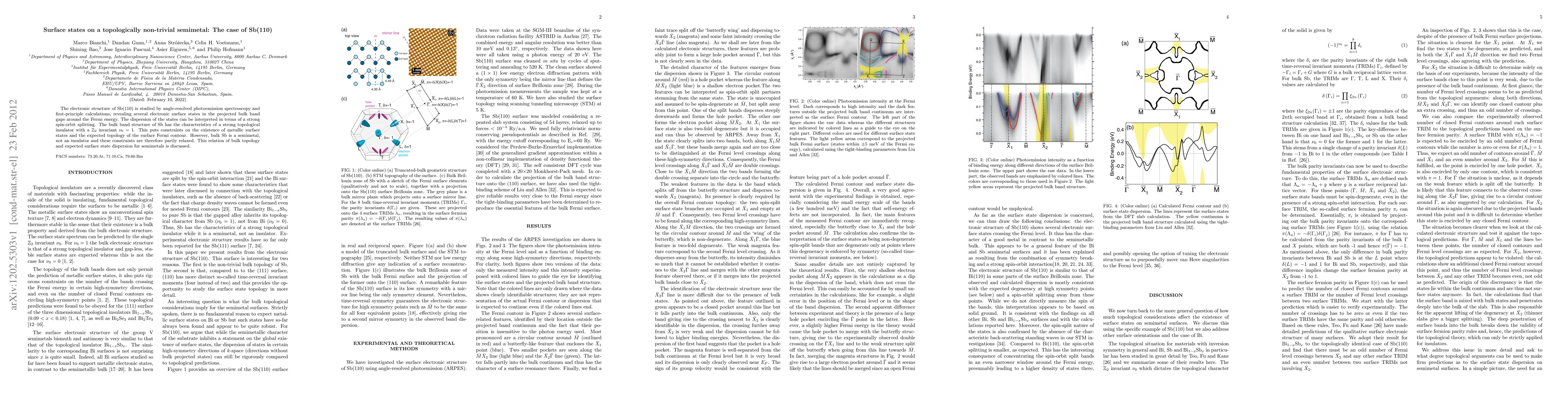 The electronic structure of Sb(110) is studied by angle-resolved photoemission spectroscopy and first-principle calculations, revealing several electronic surface states in the projected bulk band gaps around the Fermi energy. The dispersion of the states can be interpreted in terms of a strong spin-orbit splitting. The bulk band structure of Sb has the characteristics of a strong topological insulator with a Z2 invariant nu0=1. This puts constraints on the existence of metallic surface states and the expected topology of the surface Fermi contour. However, bulk Sb is a semimetal, not an insulator and these constraints are therefore partly relaxed. This relation of bulk topology and expected surface state dispersion for semimetals is discussed.