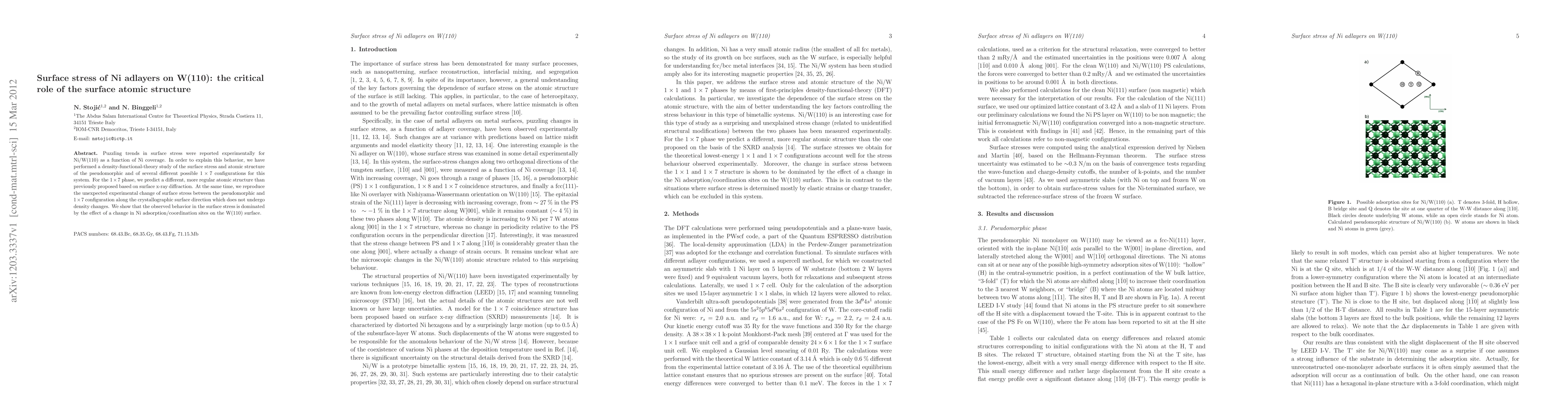 Researchers investigated the surface stress of Ni adlayers on W(110) and found that changing the nickel coverage from pseudomorphic to 1x7 configurations leads to a change in surface stress, dominated by changes in nickel adsorption/coordination sites on the surface.