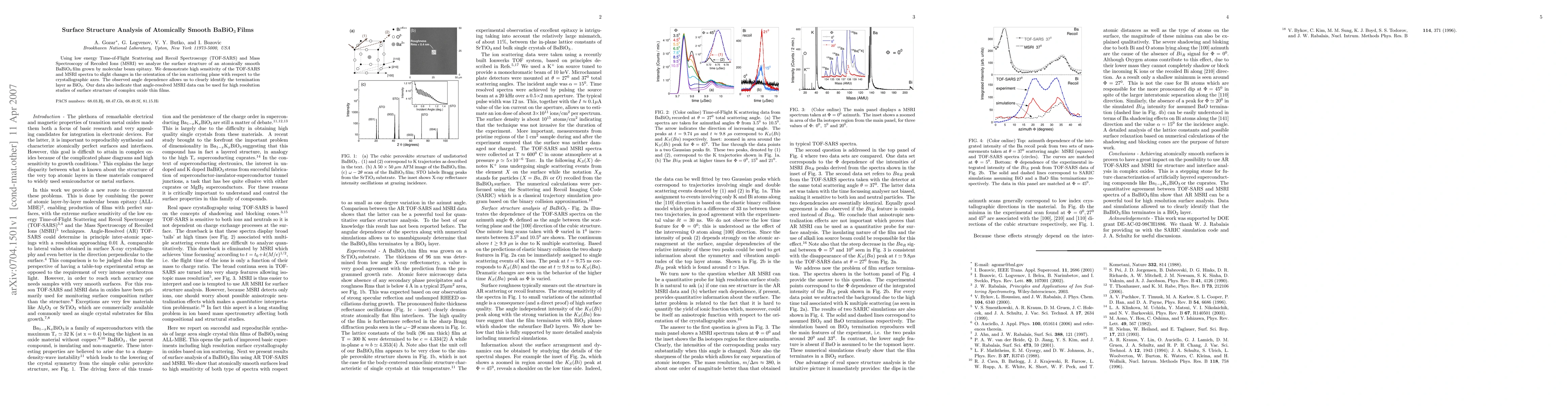 This study uses TOF-SARS and MSRI to analyze the surface structure of atomically smooth BaBiO$_3$ films, revealing the termination layer as BiO$_2$ and demonstrating high sensitivity to orientation changes. Angle-resolved MSRI data show potential for high-resolution surface structure studies of complex oxide films.