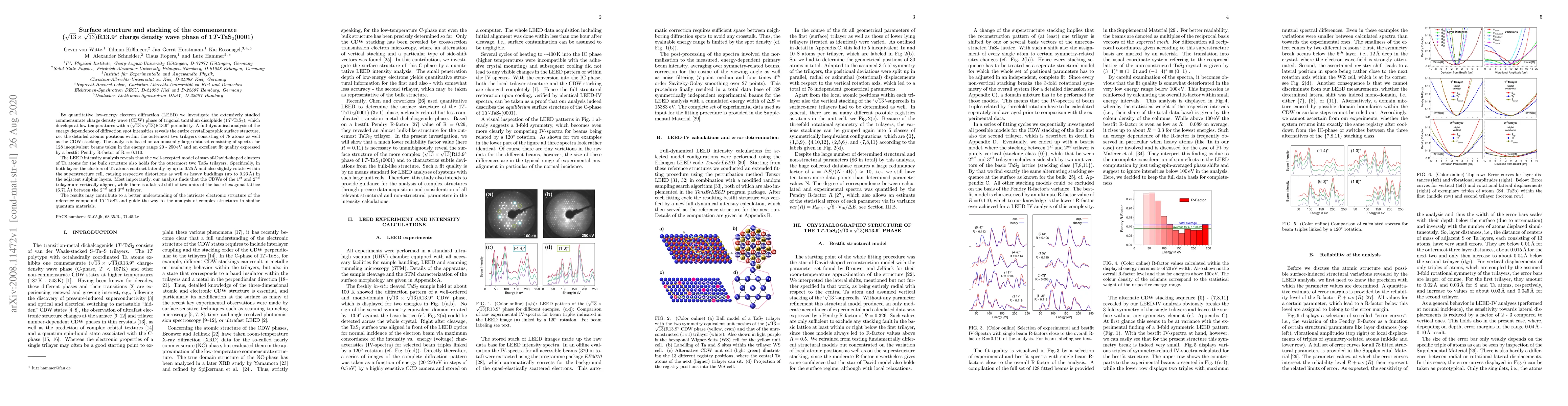 By quantitative low-energy electron diffraction (LEED) we investigate the extensively studied commensurate charge density wave (CDW) phase of trigonal tantalum disulphide (1T-TaS$_2$), which develops at low temperatures with a $\left(\sqrt{13}\times\sqrt{13}\right)$R13.9{\deg} periodicity. A full-dynamical analysis of the energy dependence of diffraction spot intensities reveals the entire crystallographic surface structure, i.e. the detailed atomic positions within the outermost two trilayers consisting of 78 atoms as well as the CDW stacking. The analysis is based on an unusually large data set consisting of spectra for 128 inequivalent beams taken in the energy range 20-250 eV and an excellent fit quality expressed by a bestfit Pendry R-factor of R=0.110. The LEED intensity analysis reveals that the well-accepted model of star-of-David-shaped clusters of Ta atoms for the bulk structure also holds for the outermost two TaS$_2$ trilayers. Specifically, in both layers the clusters of Ta atoms contract laterally by up to 0.25 $\r{A}$ and also slightly rotate within the superstructure cell, causing respective distortions as well as heavy bucklings (up to 0.23 $\r{A}$) in the adjacent sulphur layers. Most importantly, our analysis finds that the CDWs of the 1$^{\text{st}}$ and 2$^{\text{nd}}$ trilayer are vertically aligned, while there is a lateral shift of two units of the basic hexagonal lattice (6.71 $\r{A}$) between the 2$^{\text{nd}}$ and 3$^{\text{rd}}$ trilayer. The results may contribute to a better understanding of the intricate electronic structure of the reference compound 1T-TaS$_2$ and guide the way to the analysis of complex structures in similar quantum materials.