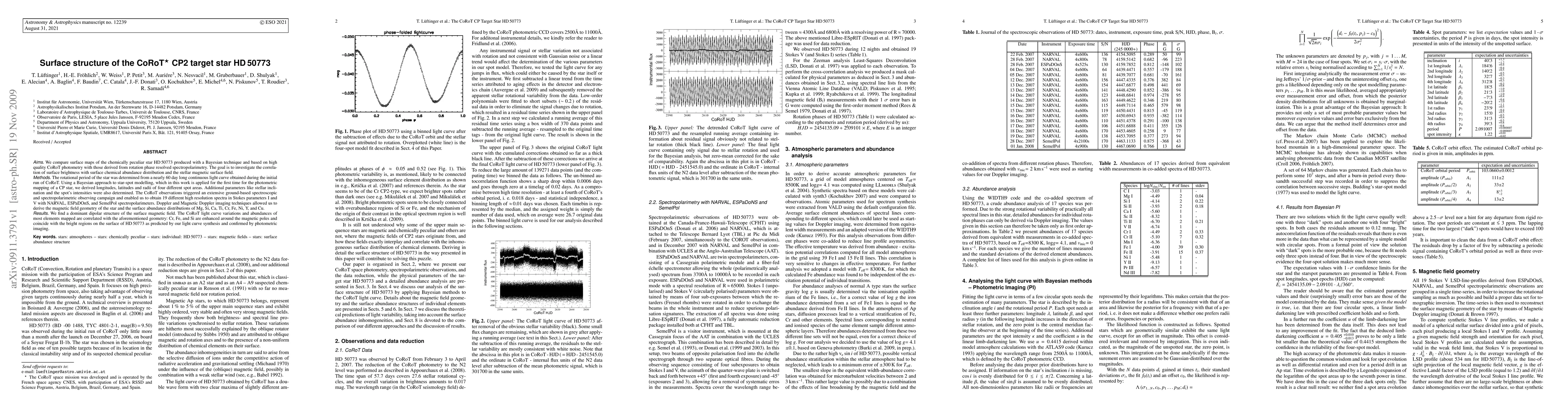 We compare surface maps of the chemically peculiar star HD 50773 produced with a Bayesian technique and based on high quality CoRoT photometry with those derived from rotation phase resolved spectropolarimetry. The goal is to investigate the correlation of surface brightness with surface chemical abundance distribution and the stellar magnetic field. The rotational period of the star was determined from a nearly 60 day long continuous light curve obtained during the initial run of CoRoT. Using a Bayesian approach to star-spot modelling, which in this work is applied for the first time for the photometric mapping of a CP star, we derived longitudes, latitudes and radii of four different spot areas. Additional parameters like stellar inclination and the spot's intensities were also determined. The CoRoT observations triggered an extensive ground-based spectroscopic and spectropolarimetric observing campaign and enabled us to obtain 19 different high resolution spectra in Stokes parameters I and V with NARVAL, ESPaDOnS, and SemelPol spectropolarimeters. Doppler and Magnetic Doppler imaging techniques allowed us to derive the magnetic field geometry of the star and the surface abundance distributions of Mg, Si, Ca, Ti, Cr, Fe, Ni, Y, and Cu. We find a dominant dipolar structure of the surface magnetic field. The CoRoT light curve variations and abundances of most elements mapped are correlated with the aforementioned geometry: Cr, Fe, and Si are enhanced around the magnetic poles and coincide with the bright regions on the surface of HD 50773 as predicted by our light curve synthesis and confirmed by photometric imaging.