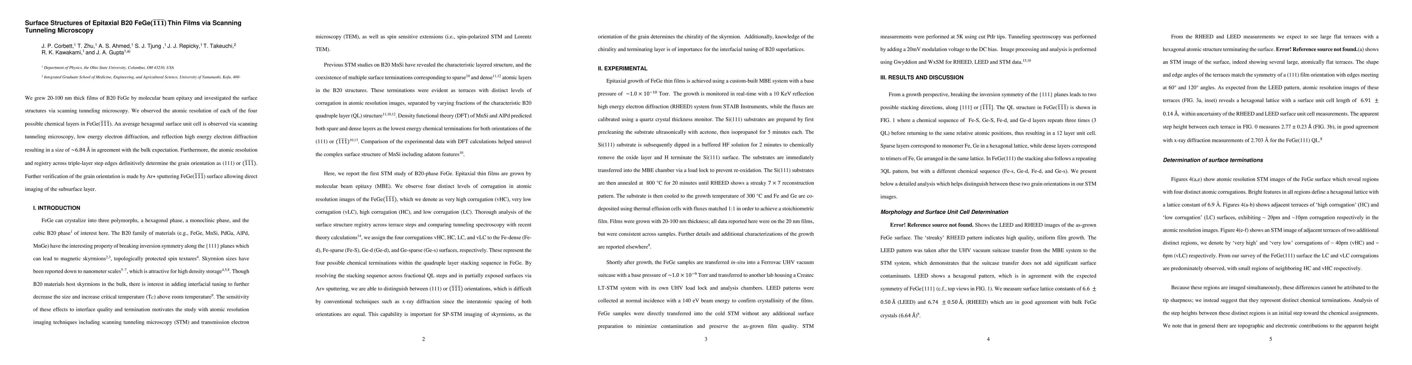 This study investigates the surface structures of epitaxial B20 FeGe thin films using scanning tunneling microscopy, revealing atomic resolution of four chemical layers in FeGe(-1-1-1) and confirming a hexagonal surface unit cell of ~6.84 Å, with grain orientation confirmed as (111) or (-1-1-1) via Ar+ sputtering.