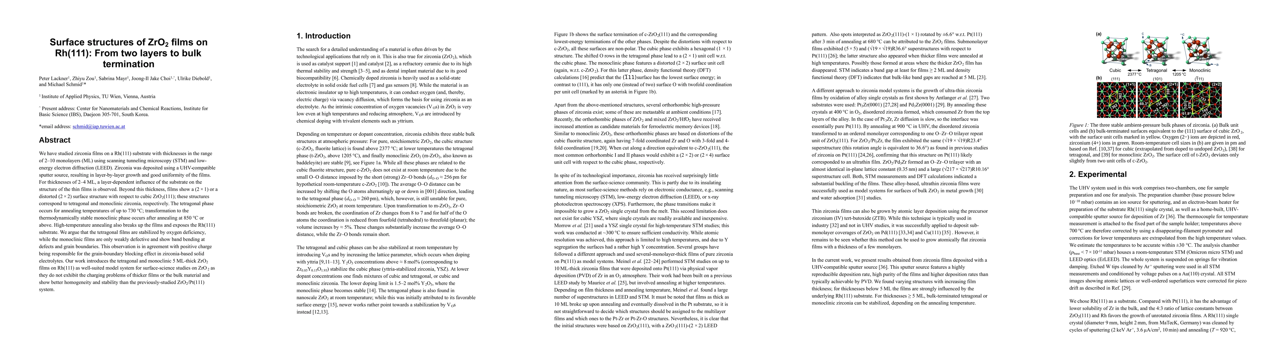 This study investigates zirconia films on Rh(111) substrates using STM and LEED, revealing structural transformations from tetragonal to monoclinic phases with increasing film thickness and annealing temperature. The films serve as a stable model system for studying zirconia surface science.